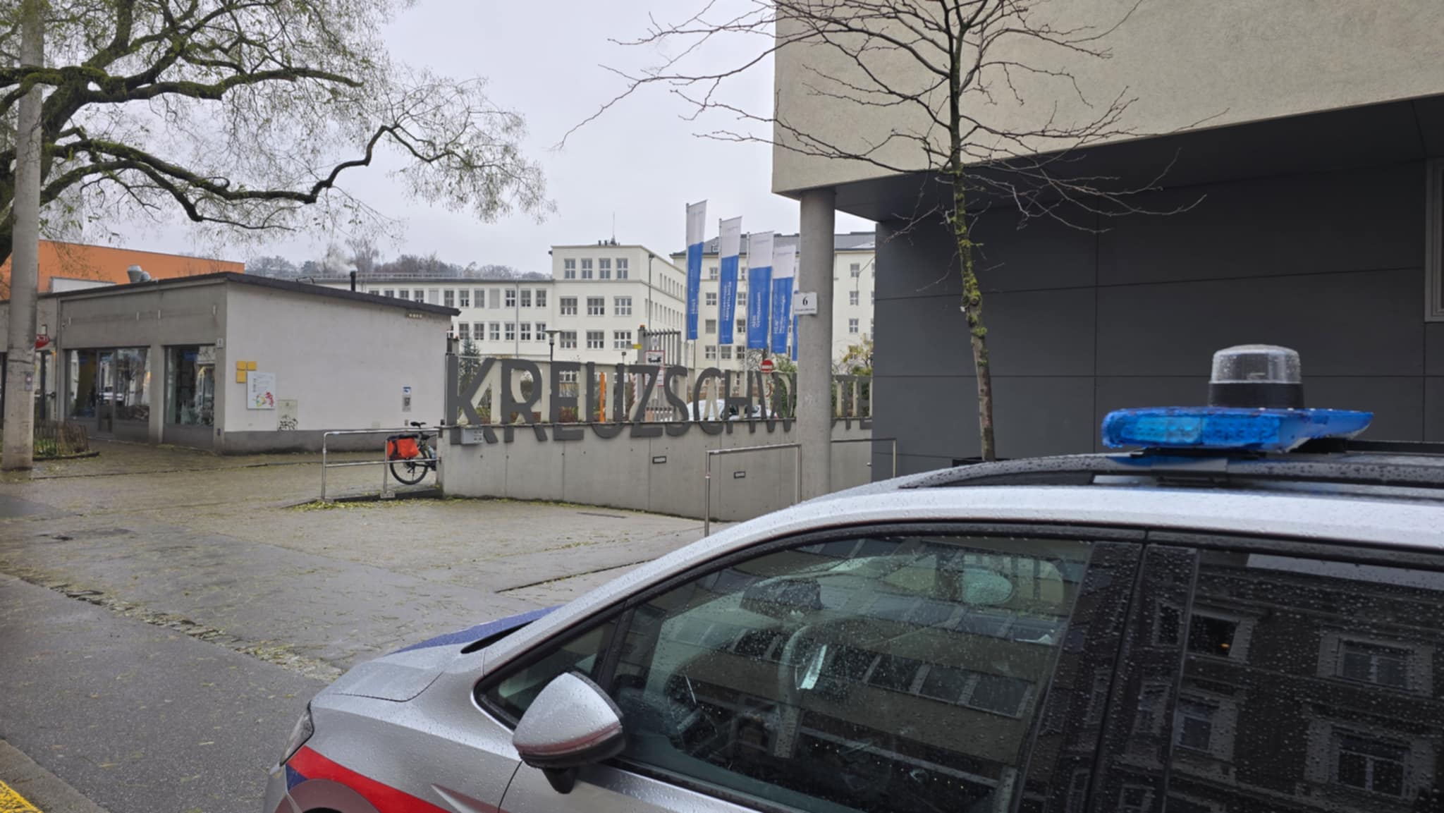 Das Gymnasium Adolf-Pichler-Platz mit Polizeipräsenz am Montagvormittag.