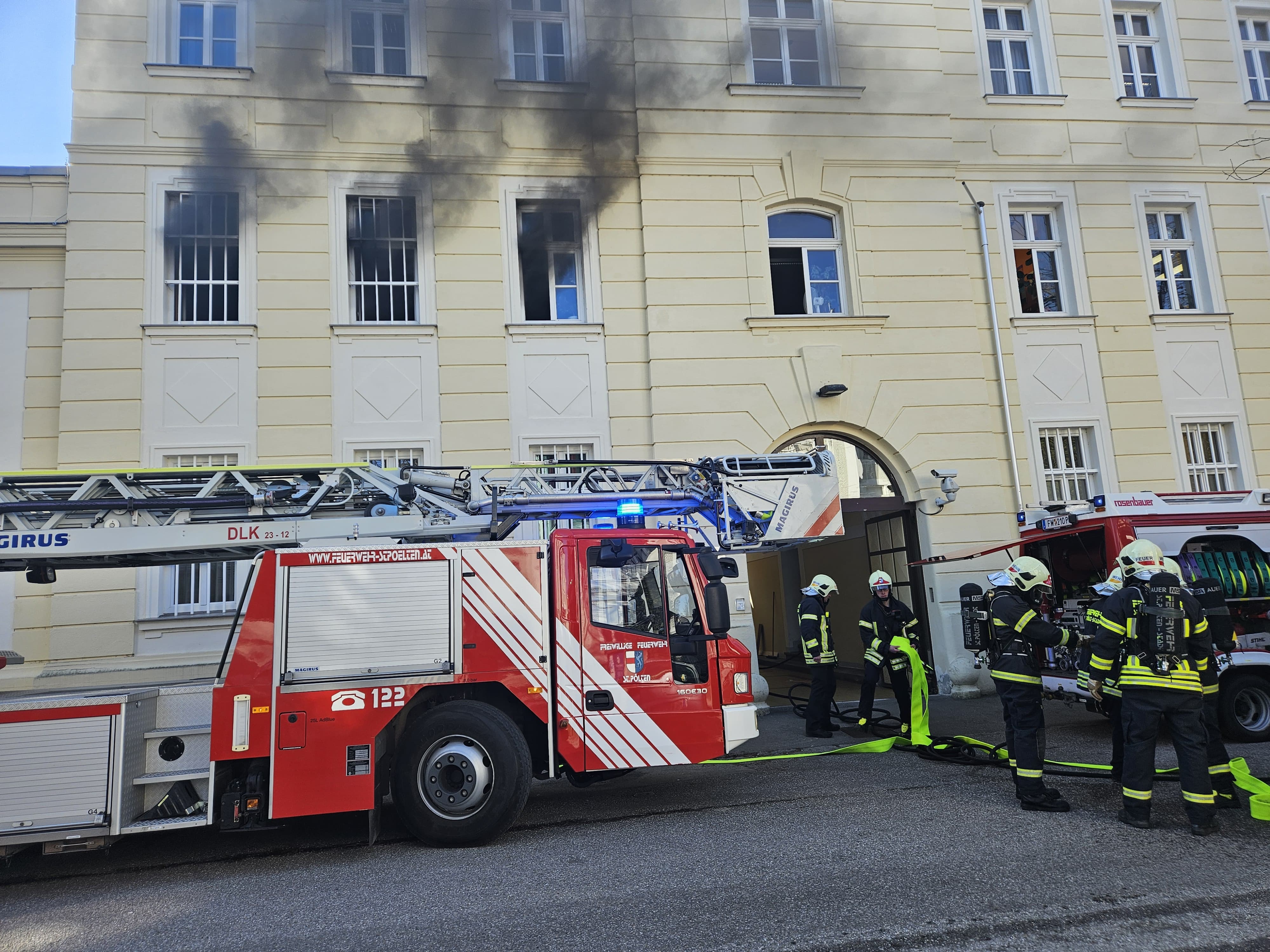 NÖ. Alarmiert wurde die Stadtfeuerwehr Donnerstagvormittag durch die automatische Brandmeldeanlage des Objektes. Nachdem der standardmäßig ausgerückte Löschzug bei Eintreffen ein Bild der Lage bekam – aus einem Fenster im 1. Obergeschoss des Verwaltungstraktes drang schwarzer Rauch – wurde sofort die Alarmstufe erhöht und weitere Kräfte in Marsch gesetzt.