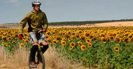 Der Jakobsweg in Spanien, ein alter Pilgerweg, der zum Grab des Apostels Jakobus in Santiago de Compostela führt, zieht jährlich Tausende Wanderer in seinen Bann. Ein nicht alltägliches Fortbewegungsmittel hat der Burgenländer Georg Dujmovits für seine Reise gewählt: Der Bruder von Snowboarderin Julia Dujmovits legte im August die rund 760 Kilometer lange Strecke von Pamplona bis Santiago de Compostela in 18 Tagen auf dem Einrad zurück.