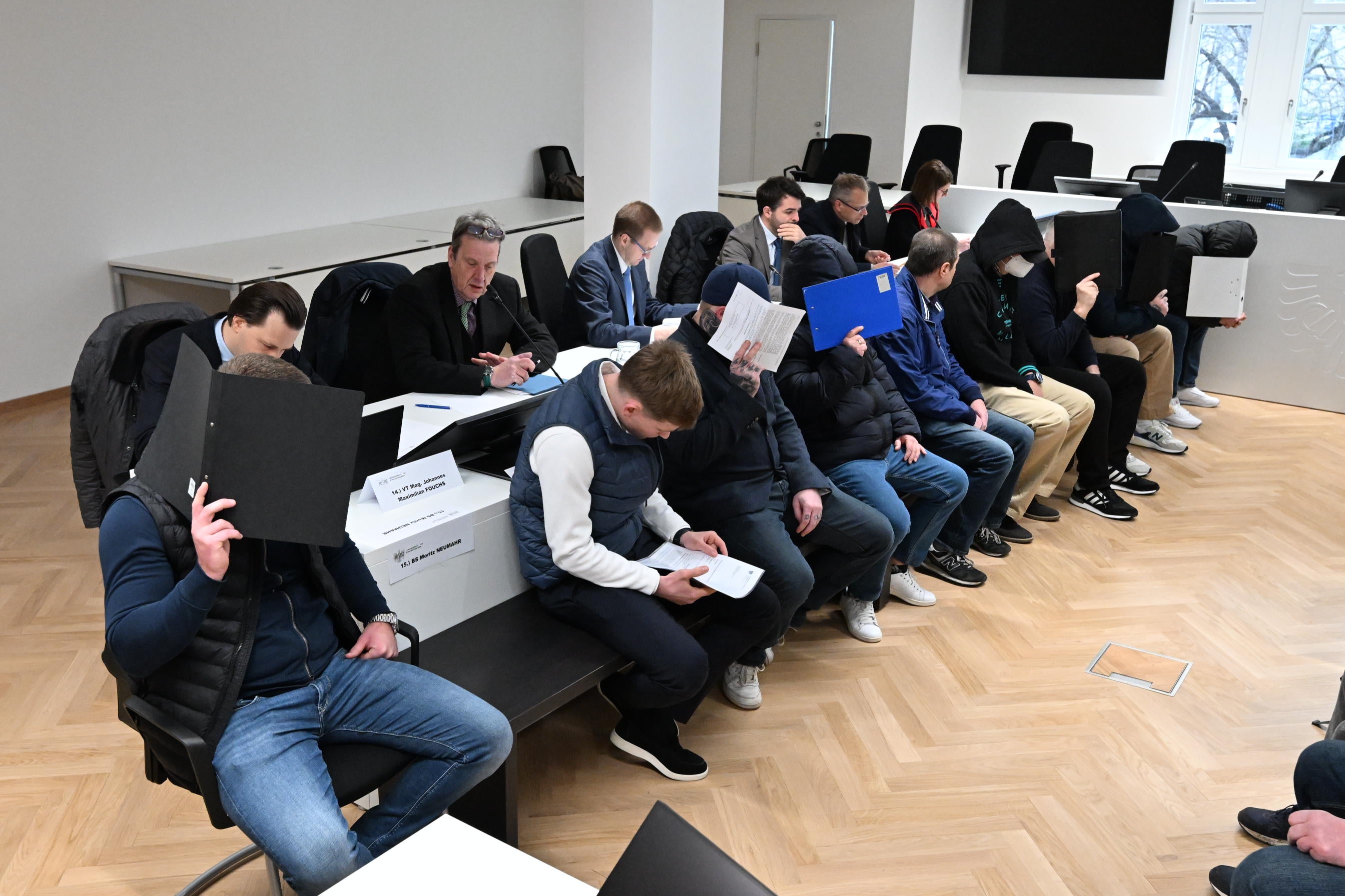 Die meisten Angeklagten waren recht medienscheu, als sie nach und nach vor dem Verhandlungssaal eintrafen. Sie hielten sich Mappen und Schnellhefter vors Gesicht, um nicht erkannt zu werden, als Fotografen und Kamerateams ihrer Arbeit nachgingen. Auch FFP-2-Masken kamen - mutmaßlich nicht im Zusammenhang mit SARS-CoV-2 - zum Einsatz. Ein Angeklagter erschien mit 32-minütiger Verspätung, wofür er sich entschuldigte.