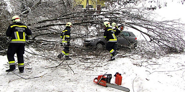 Feuerwehrleute und der Straßendienst auf der L234 zwischen Halbenrain und Klöck beim Beseitigen von Bäumen, die durch die Schnee- und Eislast umgestürzt sind.