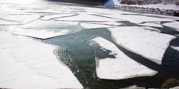 Ein Schiff bei der Anlegestelle in Muckendorf in der eisigen Donau.