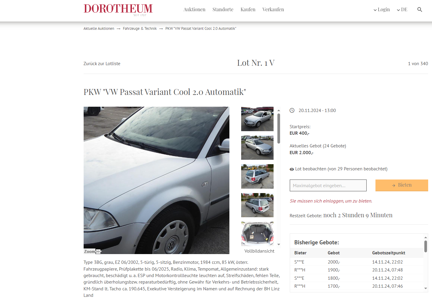 Auktionsschluss für den 20 Jahre alten VW-Passat war Mittwoch, Punkt 13 Uhr. 2000 Euro war das höchste Gebot, welches am Dienstagabend noch gesetzt wurde. Damit hat der graue und stark gebrauchte VW Passat seinen Besitzer gewechselt. 79 Prozent des Erlöses gehen an den Verkehrsicherheitsfonds, der Rest des Geldes an die BH Linz-Land.