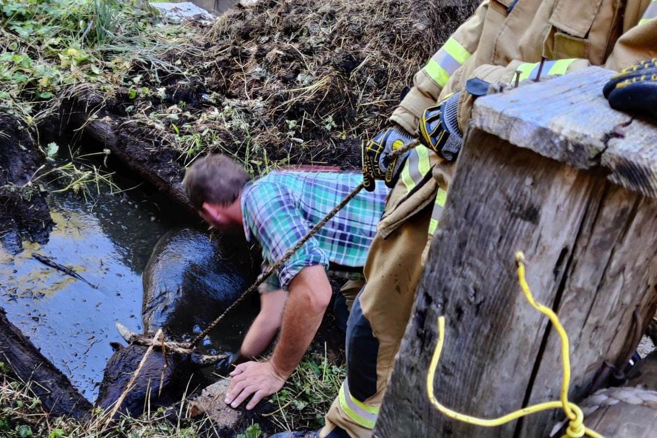 Drei Stunden lang stand die Feuerwehr im Einsatz, um ein 300 Kilogramm schweres Kalb aus seiner misslichen Lage zu retten.