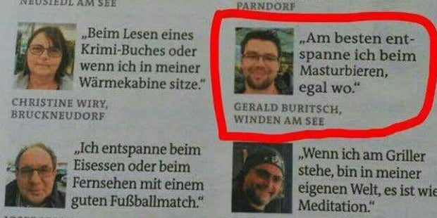 Es war für viele ein Schmankerl aus den Lokalzeitungen. Dabei war es nur eine Frage und eine Antwort im Bezirksblatt Neusiedl am See. "Wie können Sie richtig gut entspannen?". Vier Menschen antworteten darauf, eine vermeintliche Antwort belustigte daraufhin das Internet. "Am besten entspanne ich beim Masturbieren, egal wo", soll ein Herr gesagt haben. Und wie es scheint, soll das auch so in der Zeitung abgedruckt gewesen sein.