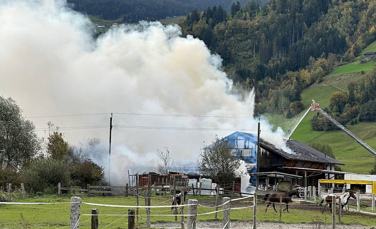 Ein Vollbrand eines Pferdestalls bzw. einer Scheune am Ortsrand von Wattens in Tirol (Bezirk Innsbruck-Land) hat Freitagnachmittag einen stundenlangen Feuerwehrgroßeinsatz ausgelöst. Die Flammen breiteten sich auch auf das angrenzenden Bauernhaus aus, das stark beschädigt wurde und vorerst unbewohnbar war. Das Pächterehepaar hatte sich in Sicherheit bringen können. Eine Fohlen und eine Katze kamen in den Flammen ums Leben. Drei Pferde konnten die Besitzer retten.
