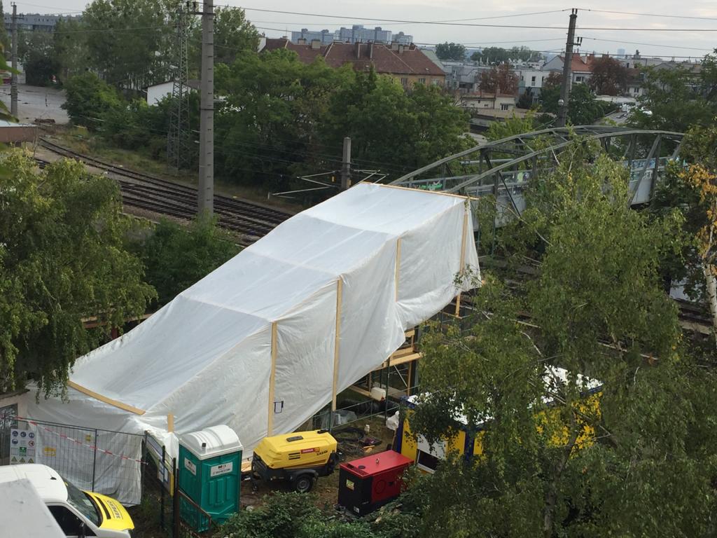 1995 verhüllte das Künstlerehepaar Christo und Jeanne-Claude den Berliner Reichstag. Eine der größten Kunstaktionen aller Zeiten. Jetzt gibt es eine Art Hommage in Wien Liesing. Die Fußgänger-Brücke in der Rudolf-Waisenhorn-Gasse ist nun wegen Bauarbeiten mit weißen Planen verhüllt. Kein Kunstwerk, sondern eine Baumaßnahme. Die Brücke über die ÖBB-Schienen wird gerade saniert. Fußgänger müssen nun weiträumig ausweichen. Die Bauarbeiten sollen mehrere Wochen dauern. Für die Anrainer bleibt aber immerhin ein Blick auf ein „Kunstwerk“. „Wir haben jetzt einen Hauch von Christo in Liesing. Nur wenn der Wind geht ist es nicht lustig. Dann wird es nämlich ziemlich laut.“
