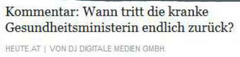 Wann tritt die kranke Gesundheitsministerin endlich zurück?" Was nicht einmal aggressive Oppositionspolitiker aus Rücksicht auf die Erkrankung von Sabine Oberhauser zu fordern wagen - Christiane Tauzher, Kolumnistin des Blättchens Heute, kennt da keinen Genierer. In ihrem Blog fordert sie Oberhauser wegen ihrer Krebserkrankung zum Rücktritt auf. Ein massiver Shitstorm auf Facebook war die Folge. Das Blättchen nahm daraufhin nach einiger Zeit den geschmacklosen Beitrag wieder offline.