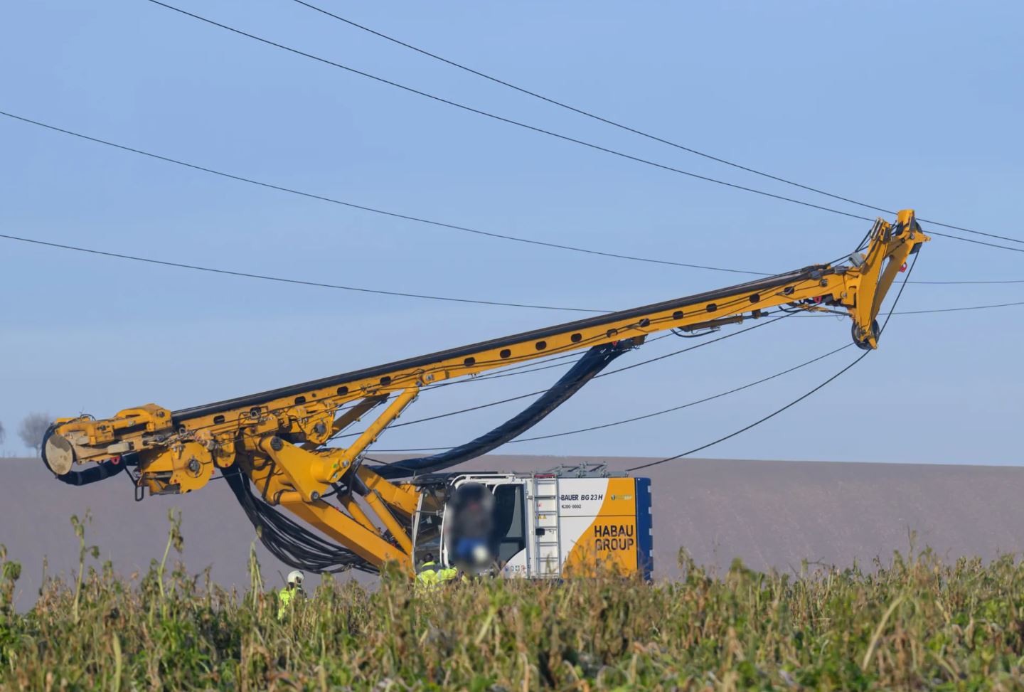 OÖ. Bei Bauarbeiten für eine Hochspannungsleitung kam es Montagvormittag in Enns zu einem Zwischenfall, als ein Drehbohrgerät beim Abtransport von einer Baustelle in eine 110-kV-Hochspannungsleitung geriet.