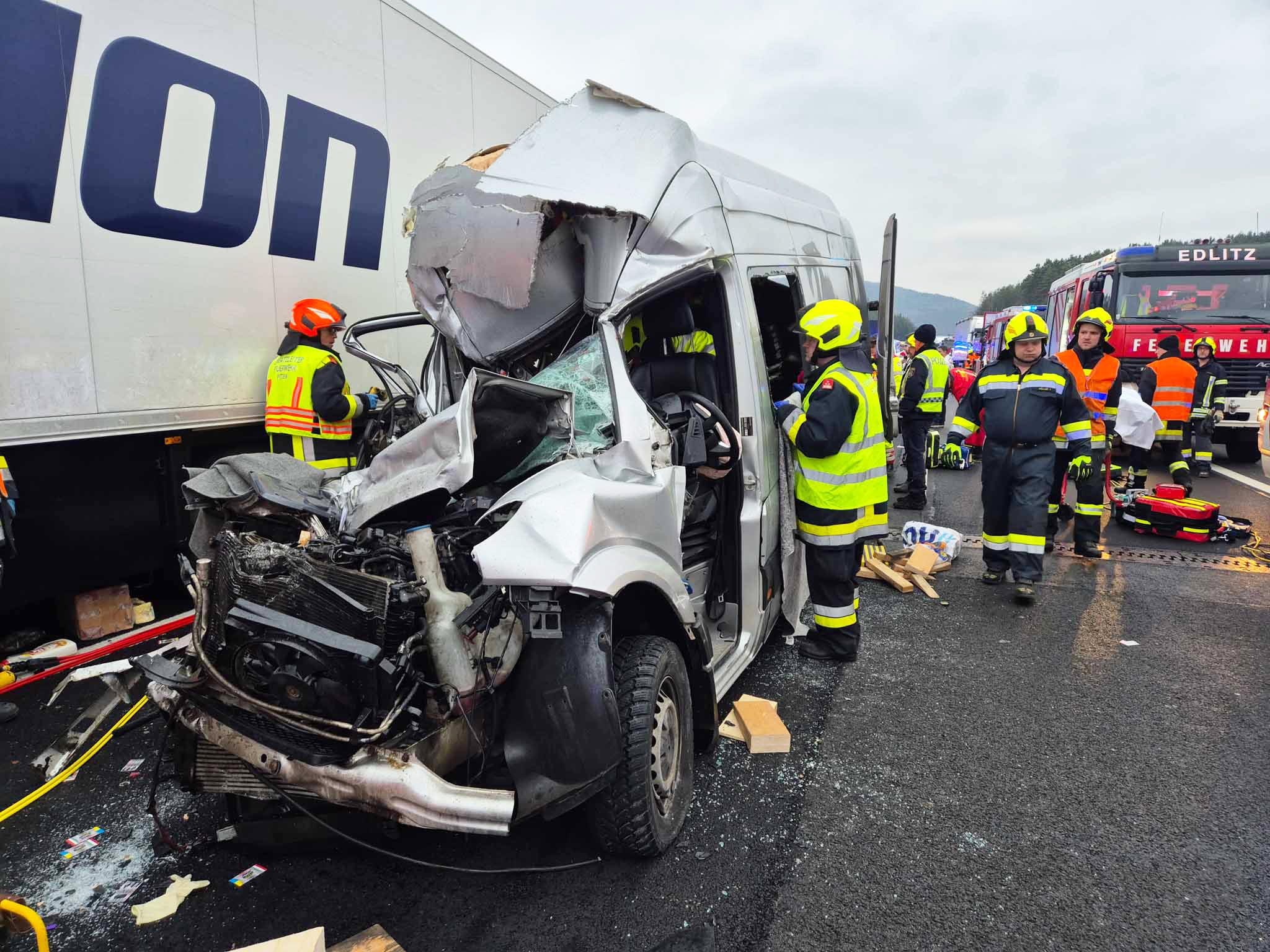 NÖ. Das Bild, das sich den Einsatzkräften Dienstagfrüh auf der Südautobahn in Fahrtrichtung Wien, direkt bei der Ausfahrt vom ASFINAG-Parkplatz Gleissenfeld, bot, bringt ein Beteiligter mit drastischen Worten so auf den Punkt: "Wir krochen bei der Bergung über Leichen. Das habe ich noch nie erlebt." Sagt ein erfahrener Floriani von der FF Pitten, der auch beschreibt, dass die anderen Insassen in dem völlig zerstörten Mercedes Sprinter, der um 6.20 Uhr - im Morgengrauen zehn Minuten vor Sonnenaufgang - auf einen Lkw aufgefahren war, in dem Wrack eingeklemmt waren und nur mit großer Mühe und unter Einsatz von hydraulischem Gerät geborgen werden konnten.