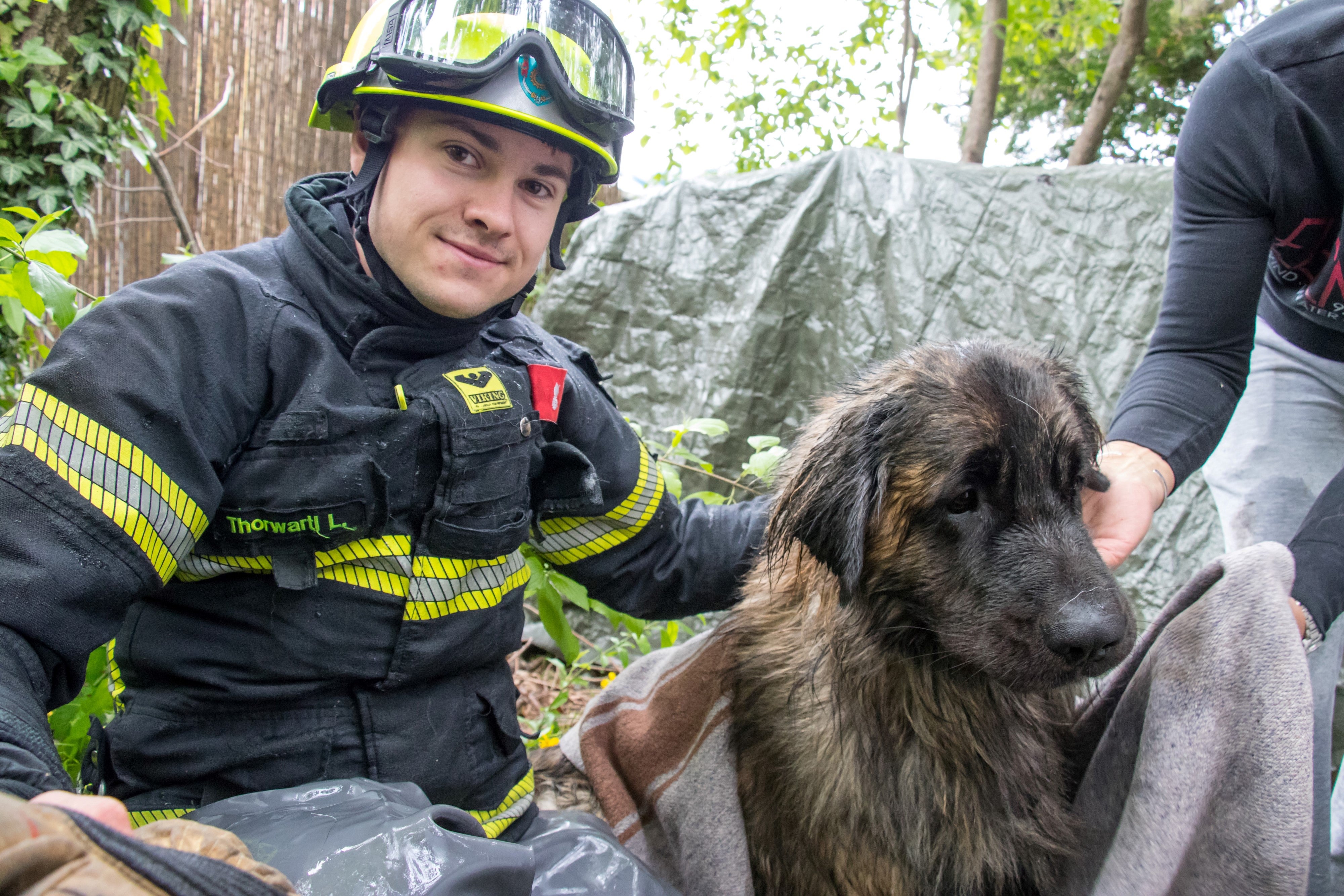Vor Ort angekommen, fand Einsatzleiter Helmut Knapp den großen Leonberger im Brunnenschacht sitzend vor.