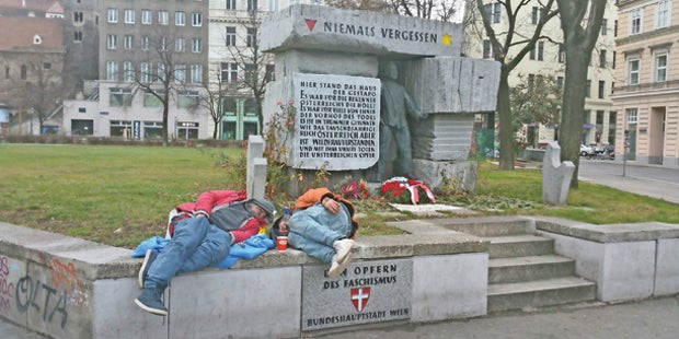 Besonders augenfällig: die Alko-Leichen, die sich das Denkmal zur Erinnerung an die Opfer der Gestapo als Schlafstätte auserkoren haben.
