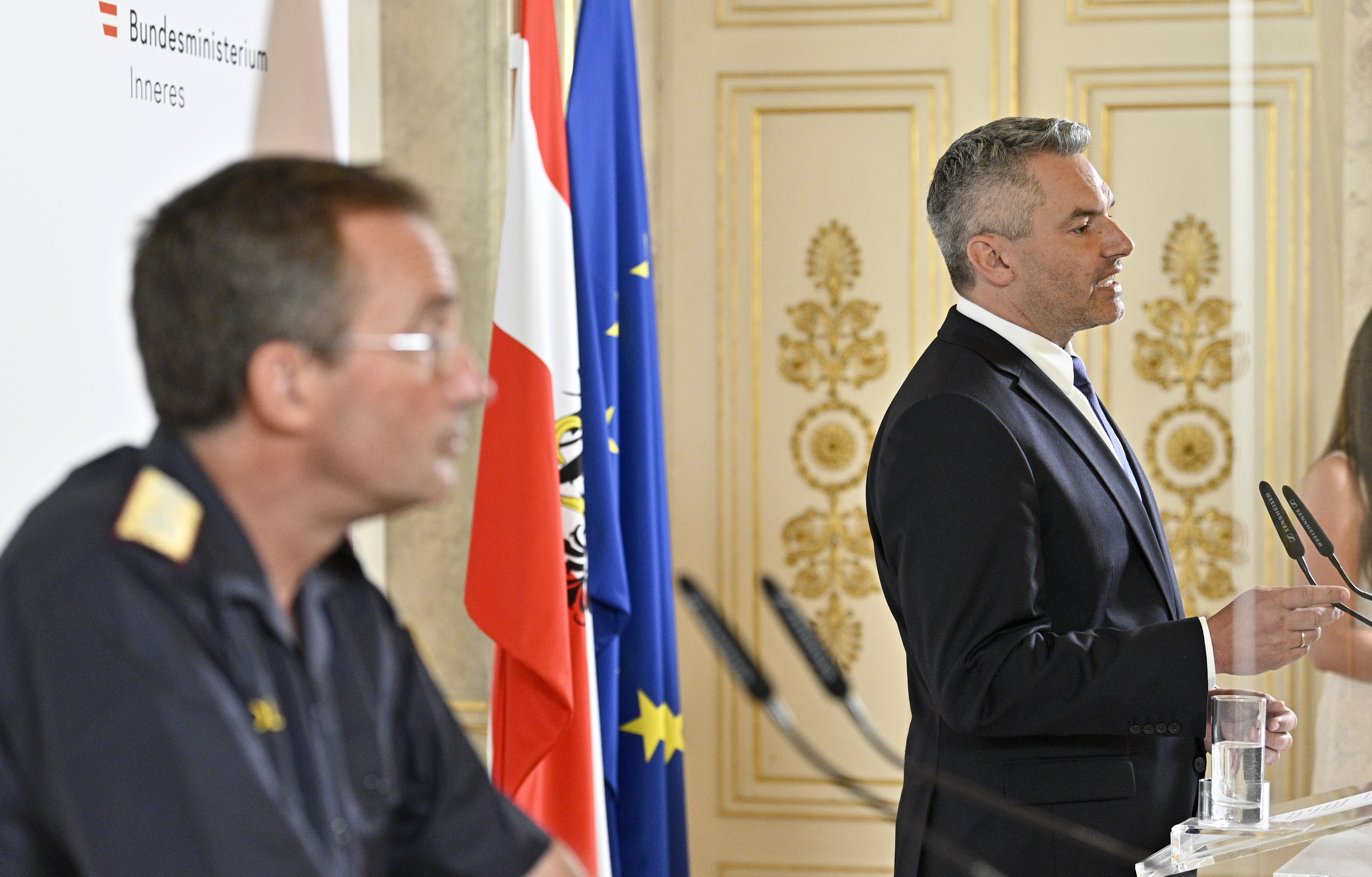 Innenminister Karl Nehammer (ÖVP) und der Wiener Polizeipräsident Gerhard Pürstl gaben am Dienstag eine Pressekonferenz über die aktuellen Entwicklungen im Fall der 13-jährigen Leonie.