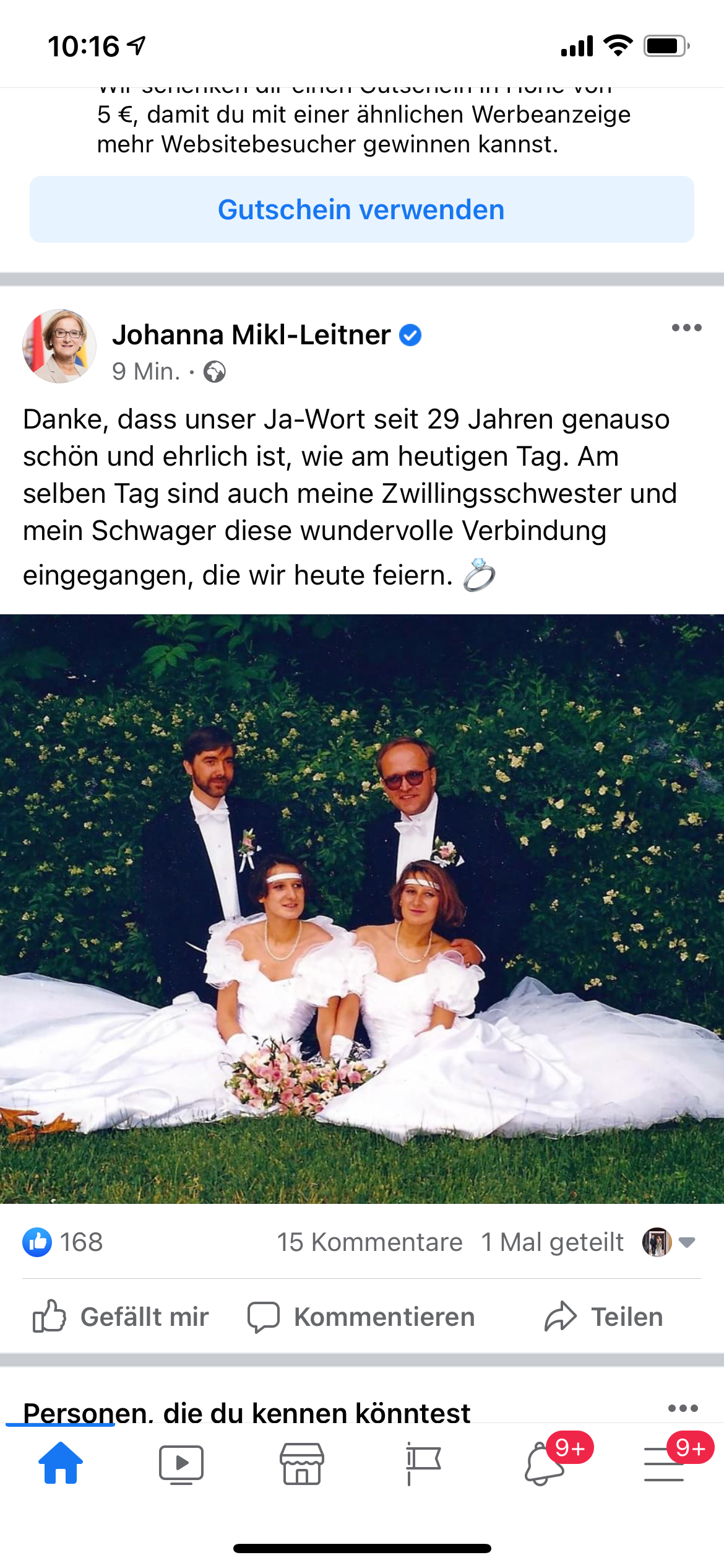 Anlässlich zu diesem Ereignis, postet Johanna Mikl-Leitner ein Foto ihrer Hochzeit vom 07.06.1992 auf Facebook. Darauf ist aber nicht nur sie mit ihrem Getrauten zu sehen, sondern auch noch eine zweite Braut, die der niederösterreichischen Landeshauptfrau zum Verwechseln ähnelt. Dabei handelt es sich um ihre Zwillingsschwester Cornelia. Die Verbindung zu ihrer Schwester ist so eng, dass die beiden sogar am selben Tag heirateten. Die Gattinnen sehen sich nicht nur ähnlich, sondern bezaubern außerdem mit den gleichen Brautkleidern und Accessoires. Eine echte Zwillingshochzeit eben.