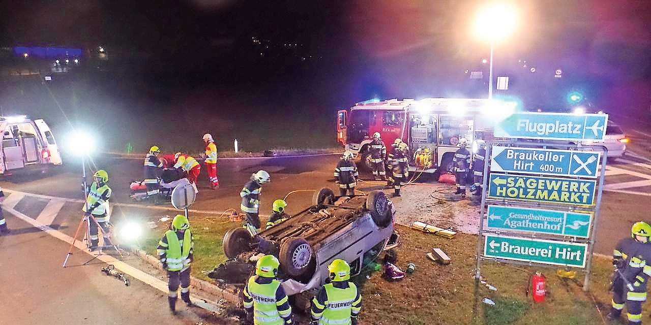 St. Veit. Ein Klagenfurter (32) kam in der Nacht auf Donnerstag mit seinem Auto in Hirt von der Straße ab und landete auf dem Dach. Der Lenker und sein Beifahrer (26) mussten von Feuerwehrmännern mittels hydraulischem Rettungsgerät befreit werden. Warum es zum Unfall gekommen ist, kann derzeit noch nicht gesagt wird. Fest steht aber, dass der 32-Jährige zum Zeitpunkt es Unfalls alkoholisiert war – das hat ein von der Polizei durchgeführter Alkoholtest ergeben. Beide Unfallopfer wurden von der Rettung ins Krankenhaus transportiert. Während des Einsatzes war die Straße für den Verkehr gesperrt.