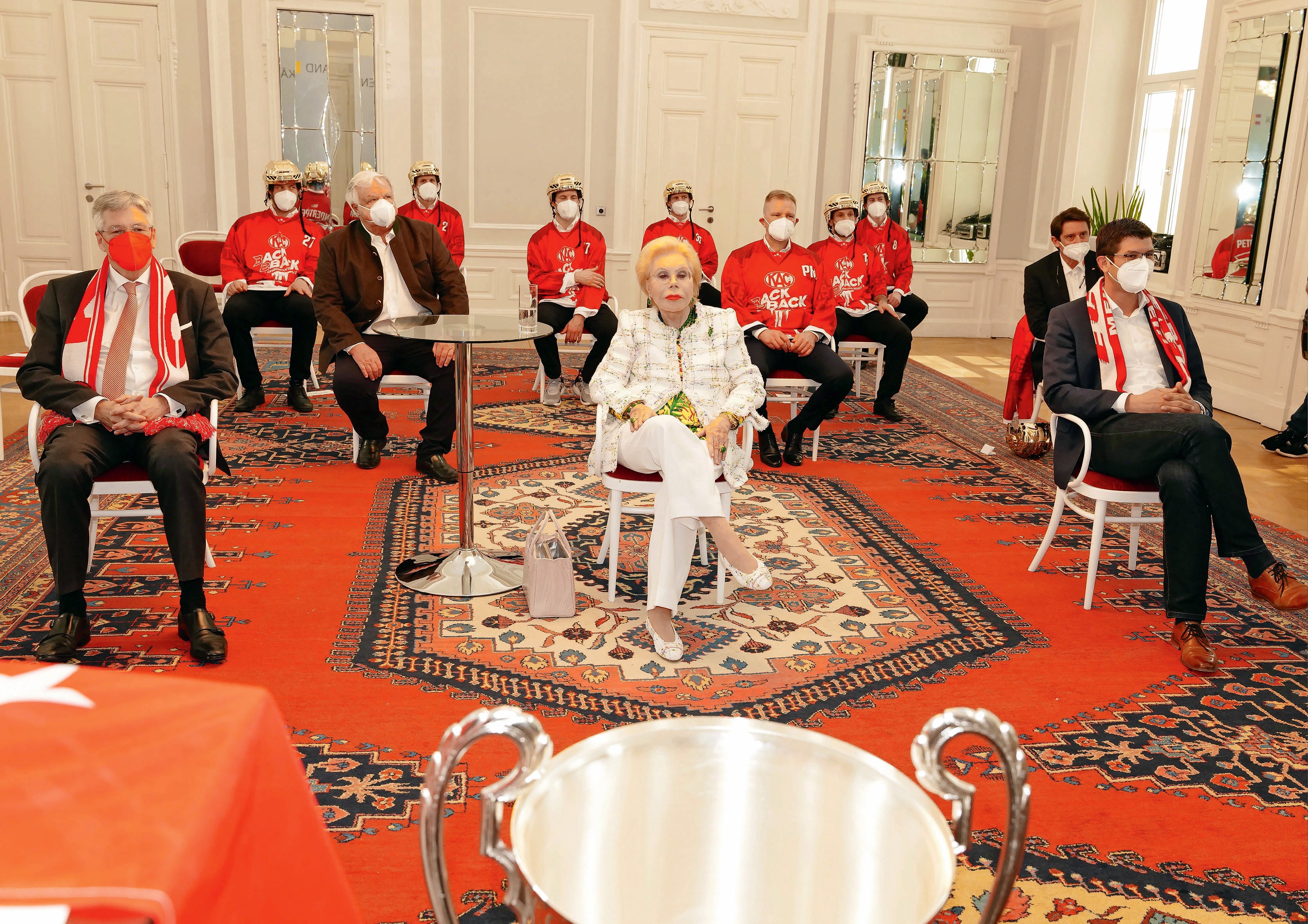 Der Klagenfurter KAC hat Grund zum Feiern: Der kürzlich zum 32. Mal zum Meister gekürte Eishockeyverein wurde am Freitag von der Stadt Klagenfurt im Spiegelsaal der Landesregierung geehrt und mit 15.000 Euro Meisterprämie ausgezeichnet. Mit dabei bei den - coronabedingt klein ausfallenden - Feierlichkeiten war nicht nur Landeshauptmann Peter Kaiser (SPÖ), sondern auch KAC-Präsidentin und Milliardärin Heidi Goëss-Horten. Alle Beteiligten trugen eine FPP2-Maske und schienen auf die Einhaltung der Abstandsregeln bedacht. Einzig Goëss-Horten verzichtete auf den nicht unwichtigen Mundschutz, als sie sich als dekadente Mäzenin im Spiegelsaal inszenierte.
