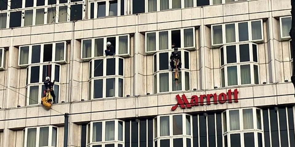 Vom Hotel aus haben Aktivisten begonnen, sich abzuseilen, um Transparente anzubringen. Dafür wurden im Voraus Zimmer im Hotel gebucht.