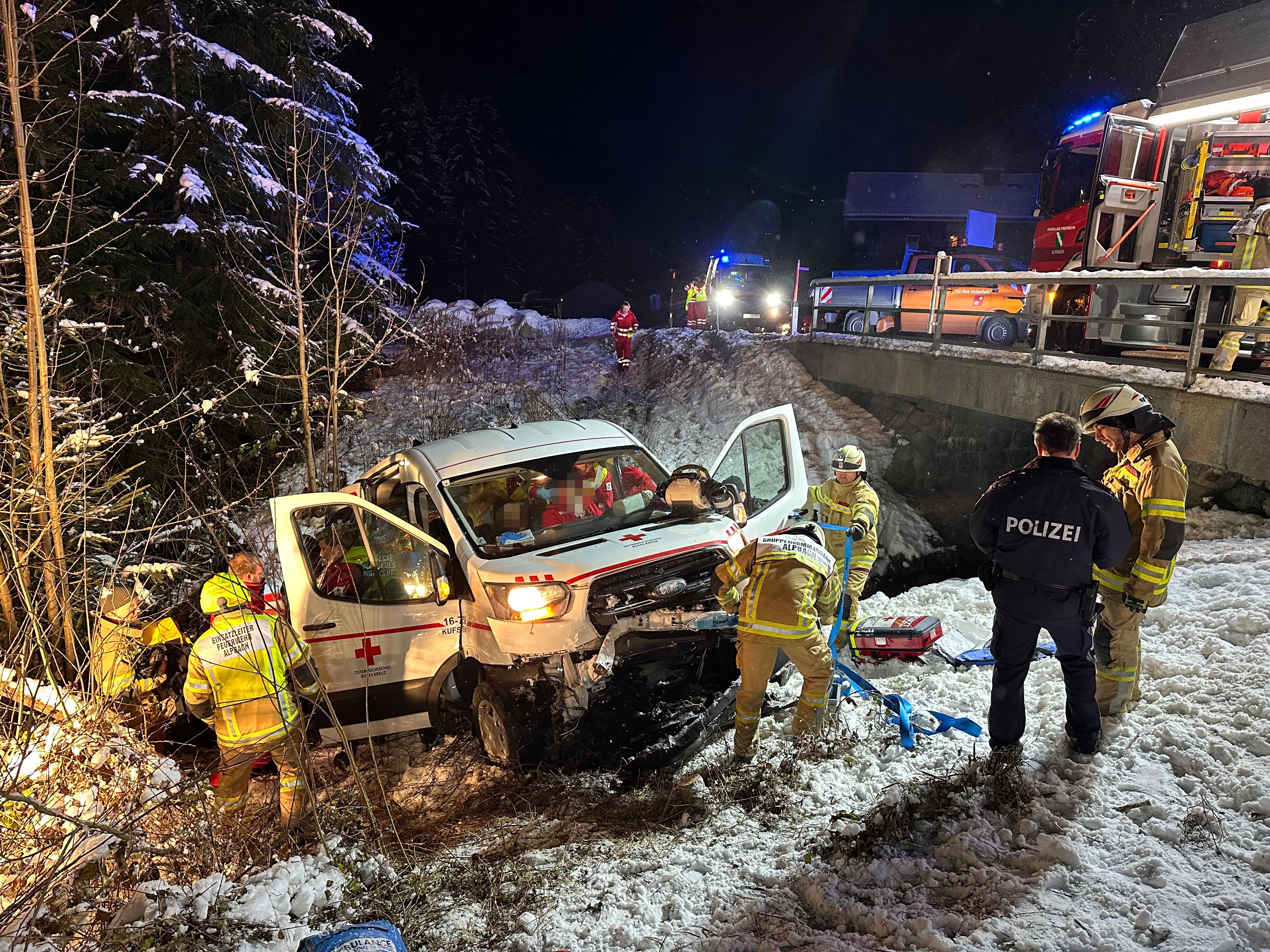Den ersten Ermittlungen zufolge hatte der Lenker Rotkreuz-Transporters einem plötzlich auf seiner Seite entgegenkommenden Fahrzeug ausweichen müssen, sodass er von der Landesstraße L 5 abkam, wo das Fahrzeug in einem Zulauf des Alpbachs schwer beschädigt zum Stillstand kam.