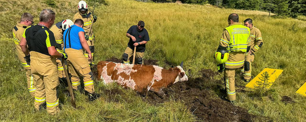 Sbg. Feuerwehr-Großeinsatz wegen einer Kuh, die am Montag in Kendlbruck auf der Alm im Sumpf steckengeblieben war. Das Tier konnte sich selbst nicht mehr aus seiner misslichen Lage befreien und stand völlig erschöpft bis zur Bauchmitte im Schlamm.