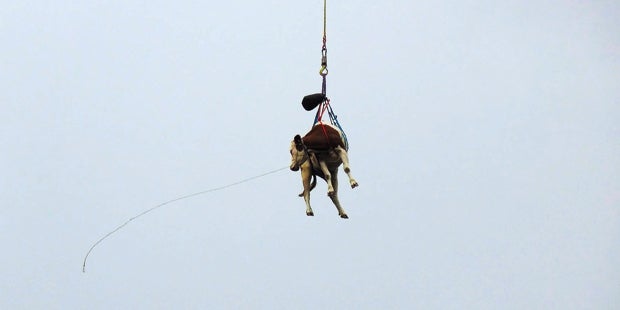 An einem Tau eines Hubschraubers wurde ein Kuh gerettet und nach Hause geflogen.
