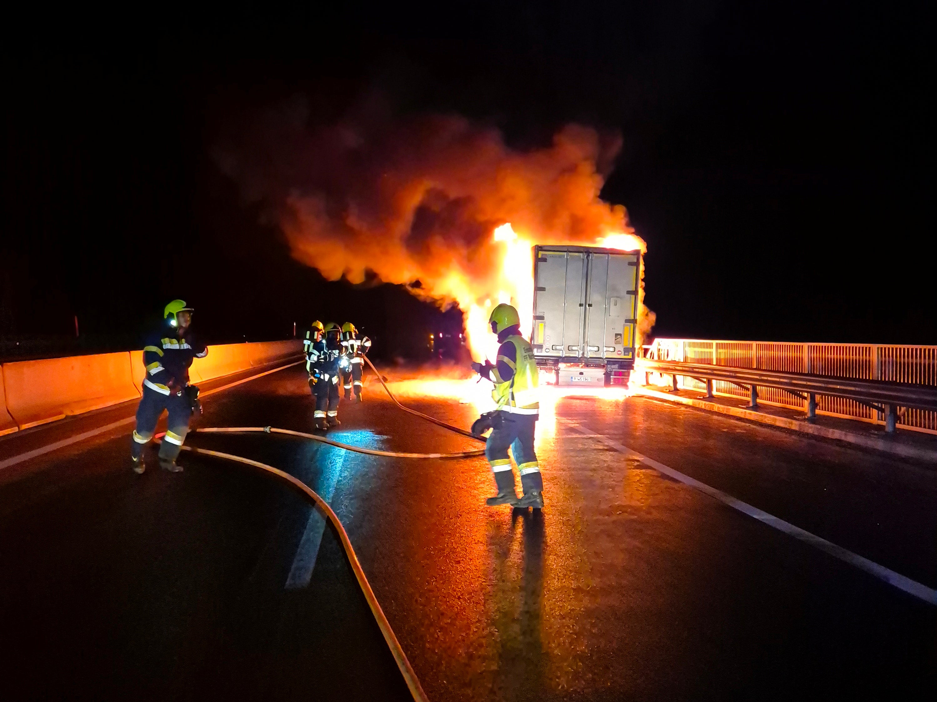 Nachdem der Grieche am Pannenstreifen ausgestiegen war, sah er, dass ein Reifen auf der rechten Seite Feuer gefangen hatte. Er versuchte noch selbst, mit einem Feuerlöscher den Brand unter Kontrolle zu bringen, was ihm allerdings nicht gelang. Das Feuer breitete sich rasch auf die Bordwände aus. Um das Zugfahrzeug vor den Flammen zu schützen, sattelte der Mann den Aufleger ab und fuhr noch einige Meter weiter.