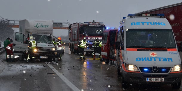 Zu einem schweren LKW Unfall kam es Dienstag Früh in Wiener Neudorf. Aus bisher unbekannter Ursache fuhr ein Möbeltransporter kurz vor der Ausfahrt Wiener Neudorf in Fahrtrichtung Graz auf einen anderen LKW auf. Der Fahrer des Möbeltransporters wurde dabei verletzt und in seinem Führerhaus eingeklemmt.