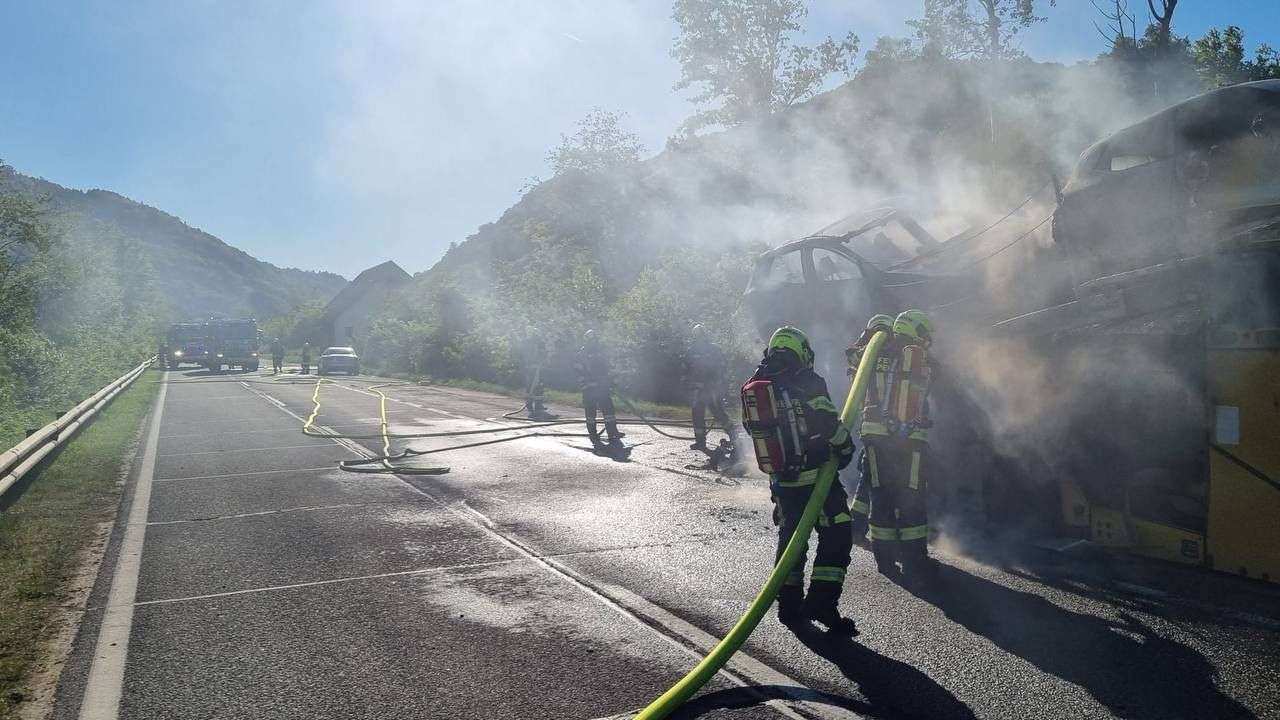 Ein Autotransporter ging bei der Donau Straße B3 im Bezirk Melk (NÖ) am Dienstagabend in Flammen auf. Es soll sich bei den brennenden Fahrzeugen um E-Autos handeln.