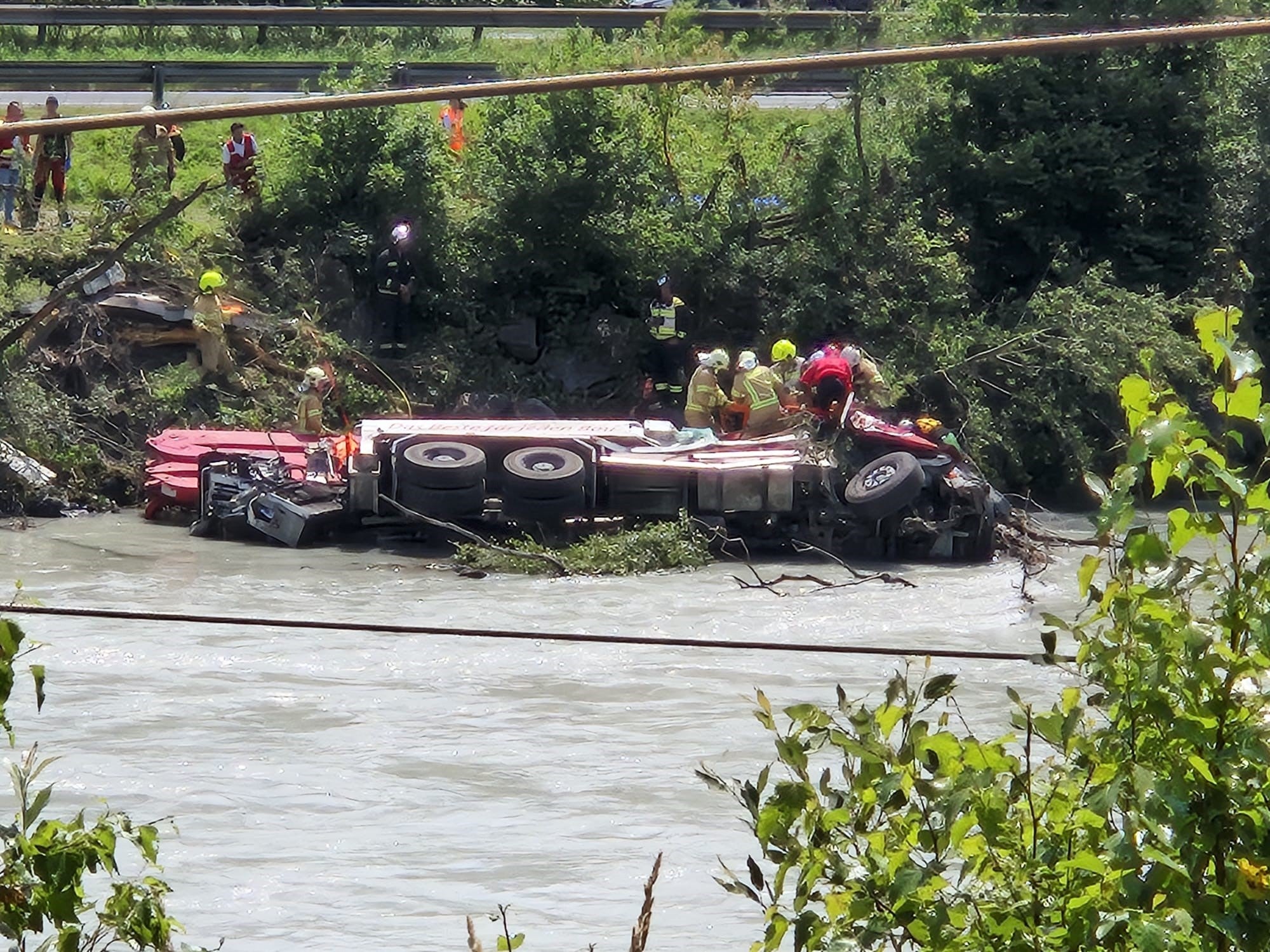 Das Schwerfahrzeug eines großen Bauunternehmens mit Sitz in Vomperbach hatte die Leitschiene durchbrochen und war ersten Informationen zufolge auf der Seite des Führerhauses im Wasser zu liegen gekommen.