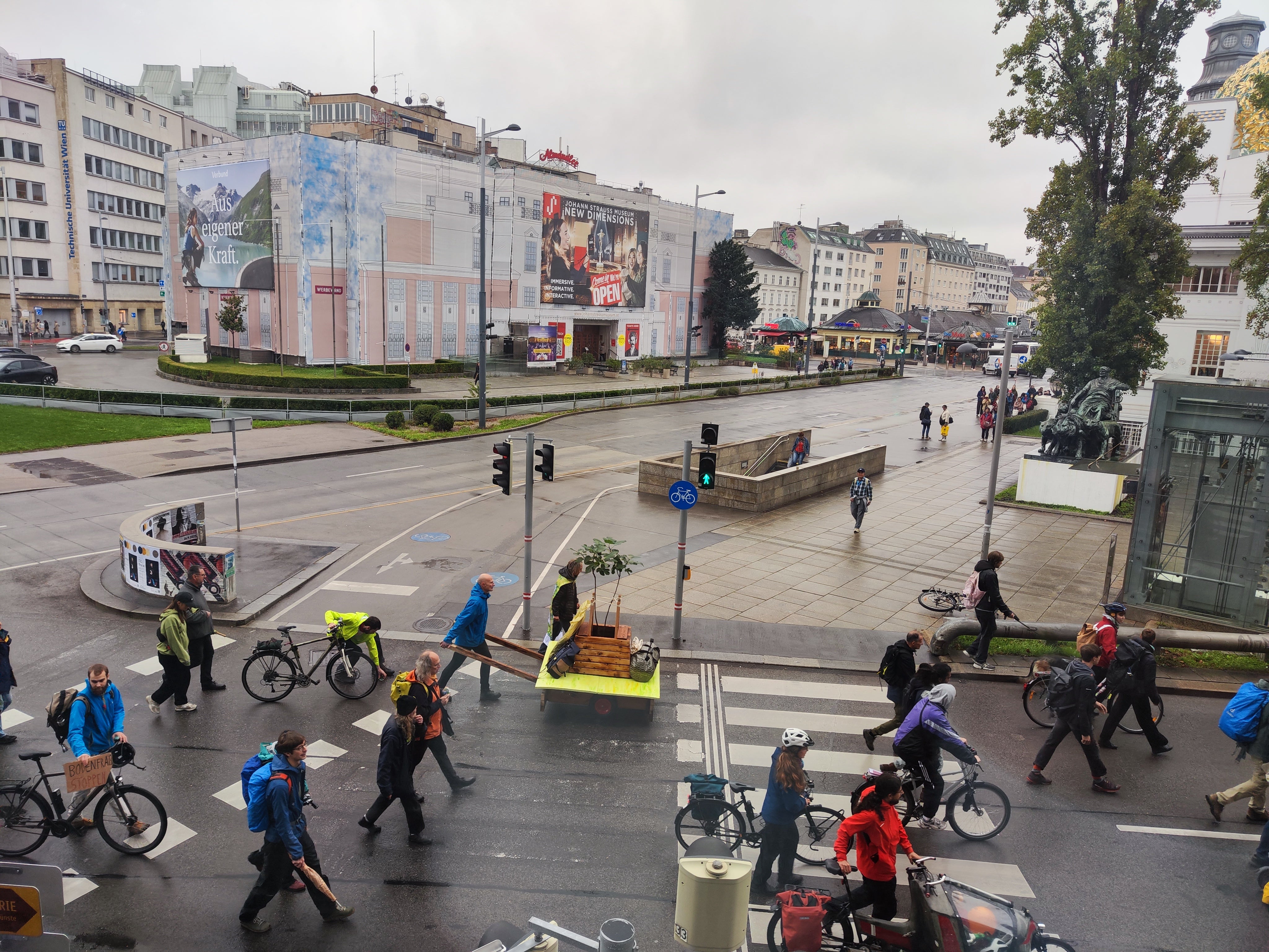 Lobautunnel-Gegner schieben Baum an der Secession vorbei hinaus zur Mariahilfer Straße.