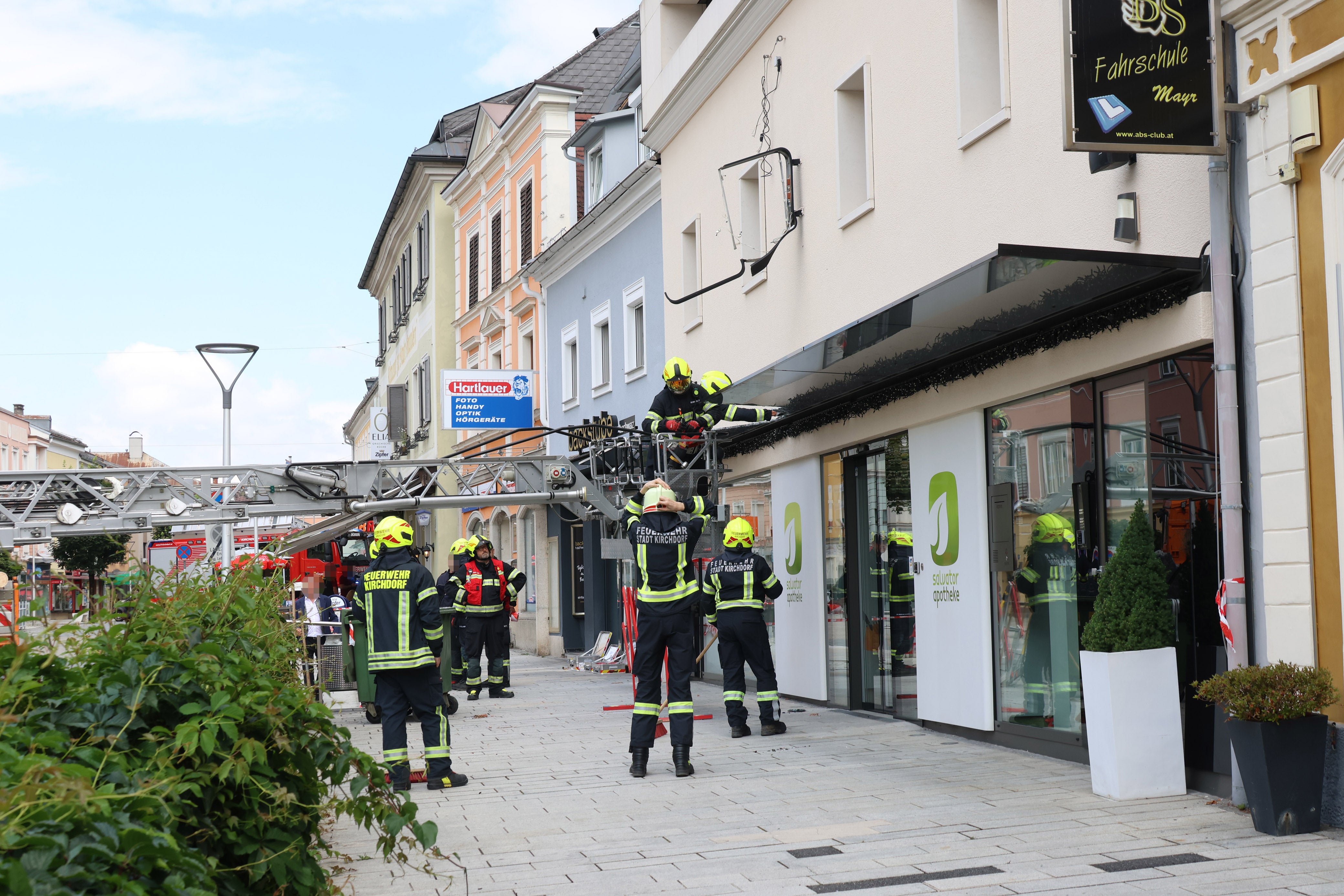 Anschließend rückte die Feuerwehr an, räumte den gefallenen Baum weg und den Stadtplatz wieder auf. Unter anderem wurden die Reste des Glas-Vordachs der Apotheke entfernt und das Seil sowie die beschädigte Reklametafel abmontiert.