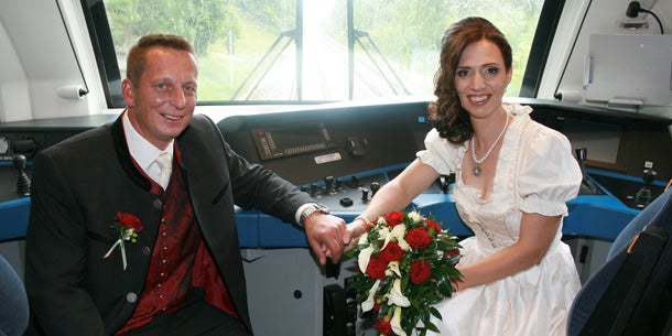 Premiere auf Österreichs Schienen: Zwei Lok-Führer gaben sich im Rail-Jet bei 220 km/h das Ja-Wort.