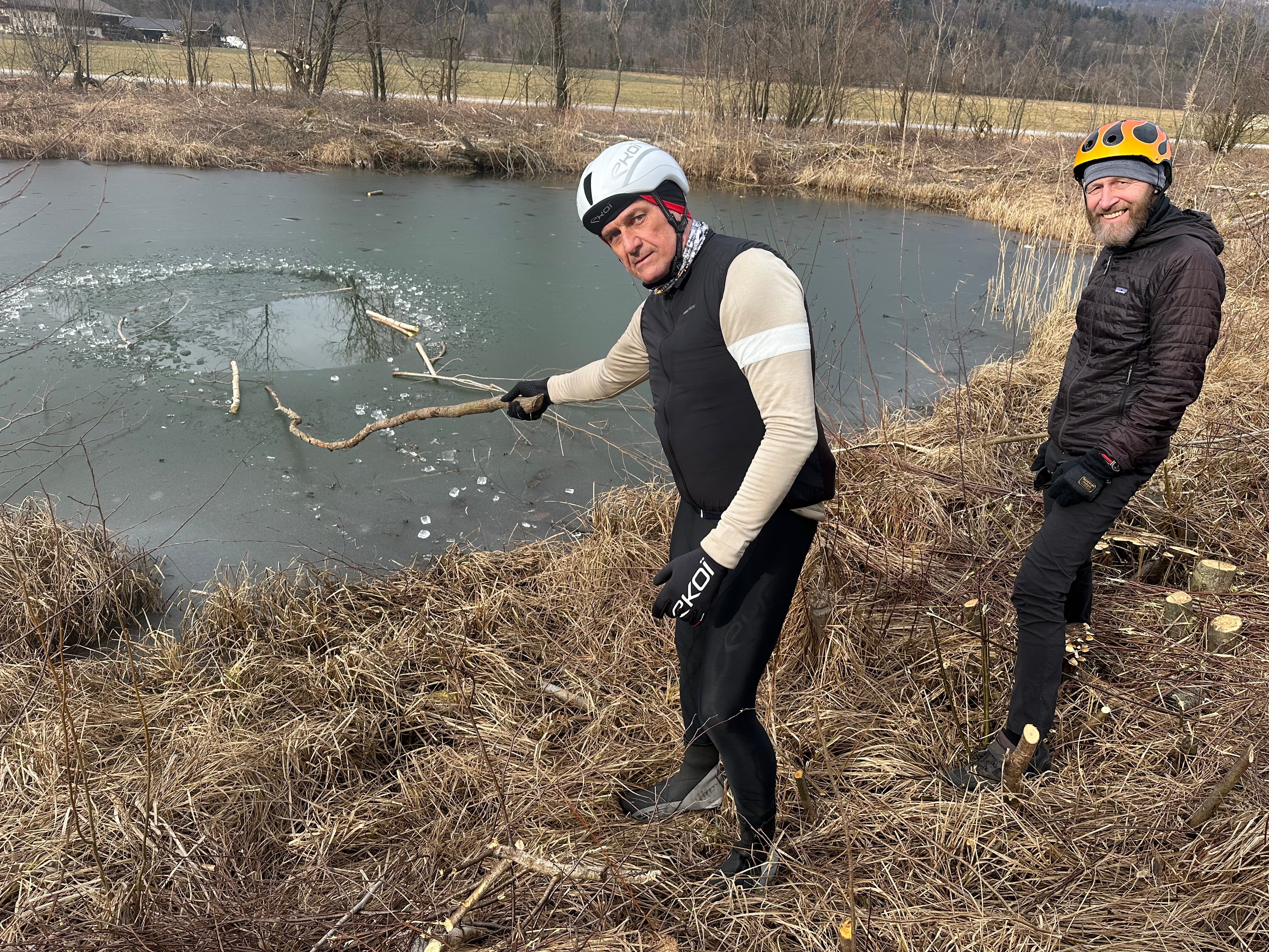Die beiden Freunde waren ihre "gewohnte Runde gefahren. Als wir beim Teich vorbeigekommen sind, haben wir zunächst leise eine Stimme gehört. Weil die Büsche hier im Winter nicht so dicht sind, haben wir gleich gesehen, wie ernst die Lage ist." Der Kufsteiner Rene A. (53) rief die Rettung, während Alexander K. aus Wörgl zu einer geeigneter Stelle radelte. Zuerst warf er ihr Äste zu, damit die Frau sich selbst herausziehen sollte - doch sie war schon zu entkräftigt. "Da hab ich", erzählt K. "Da hab ich einen halben Bam ausgerissen, um an einen großen Ast zu kommen. Gemeinsam haben wir es dann geschafft, dass sie ans rettende Ufer kam."