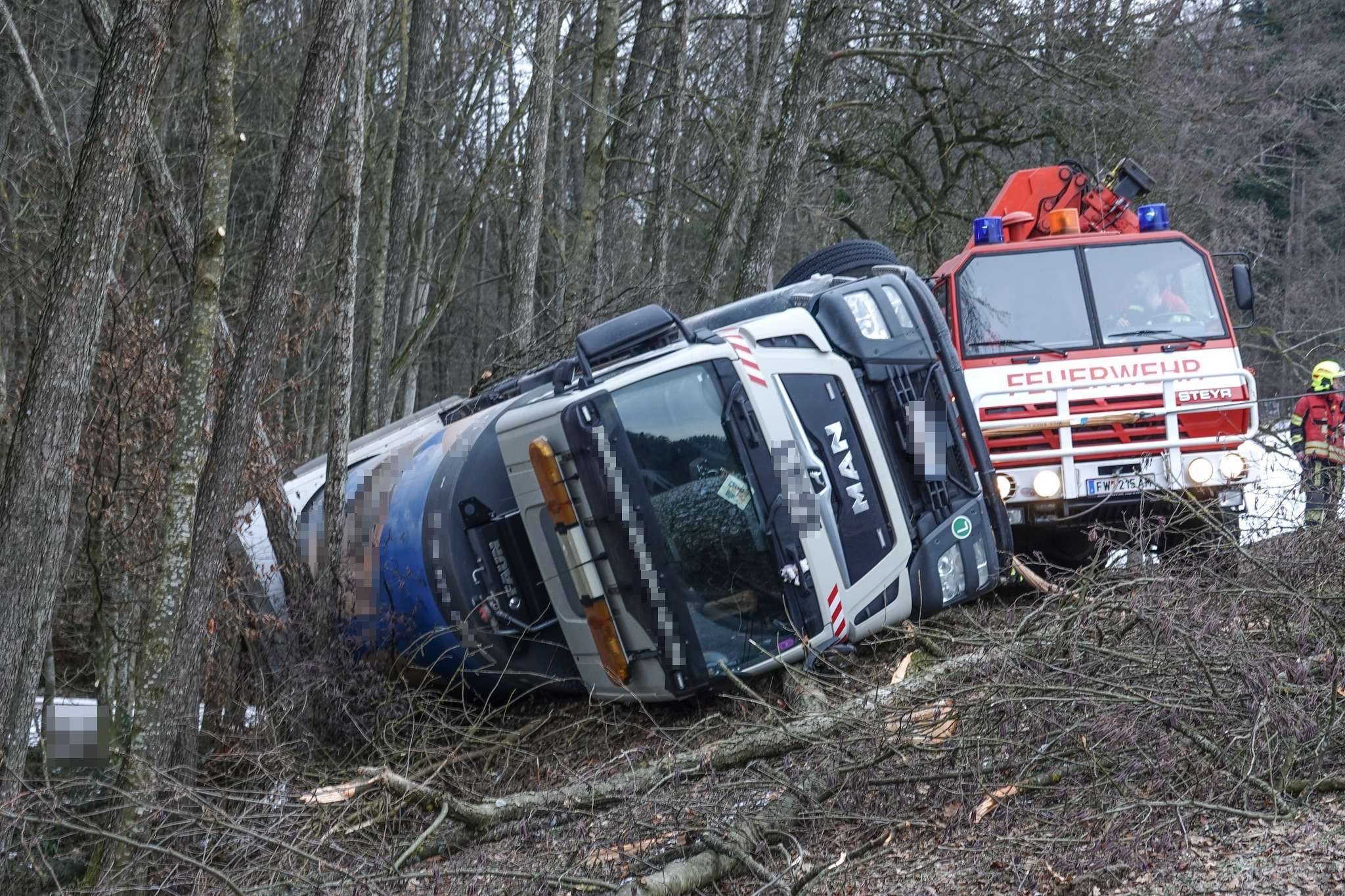 Schlimmer Unfall in der Früh. Der Lenker eines Müllwagens verlor bei Dachgrub im Gemeindegebiet von Neustadt/Donau (Bezirk Amstetten, NÖ) die Kontrolle über das Fahrzeug. Auf einem steilen und mit Schnee bedeckten Güterweg kam der Laster ins Rutschen und stürzte die Böschung hinab. Den Absturz stoppten schließlich Bäume, doch das Fahrzeug blieb umgekippt liegen.