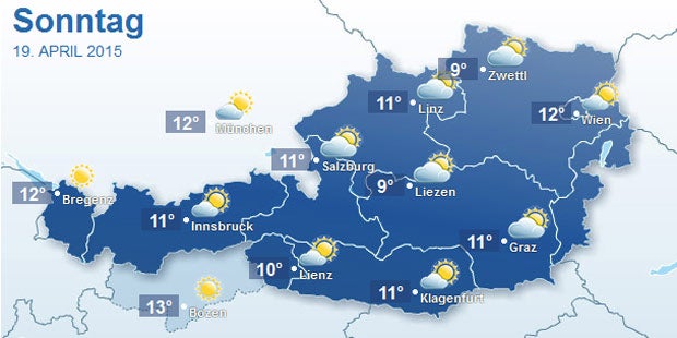 Nach dem Temperatursturz am Freitag und Samstag mit Tiefstwerten um die 10 Grad wird es am Sonntag überwiegend sonnig und zumeist trocken. Am häufigsten scheint die Sonne im Westen, am mildesten ist es in Tirol und Vorarlberg.
