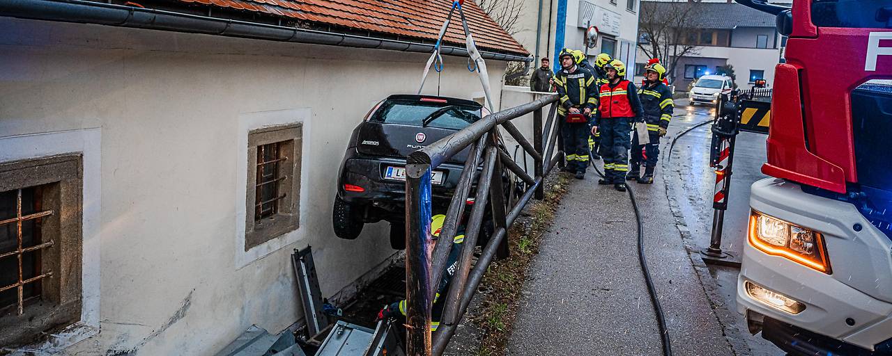 OÖ. Nasse Fahrbahn und Schlamm führten am Wochenende mitunter zu spektakulären Unfällen. In Tragwein (Bezirk Freistadt) kam es Samstagnachmittag zu einem Verkehrsunfall, bei dem ein Fahrzeug von der Straße abkam und sich zwischen zwei Mauern verkeilte. Der 58 jährige Fahrer konnte sich nicht selbst befreien und wurde von der Feuerwehr durch den Kofferraum gerettet. Der Mann musste ins Krankenhaus.