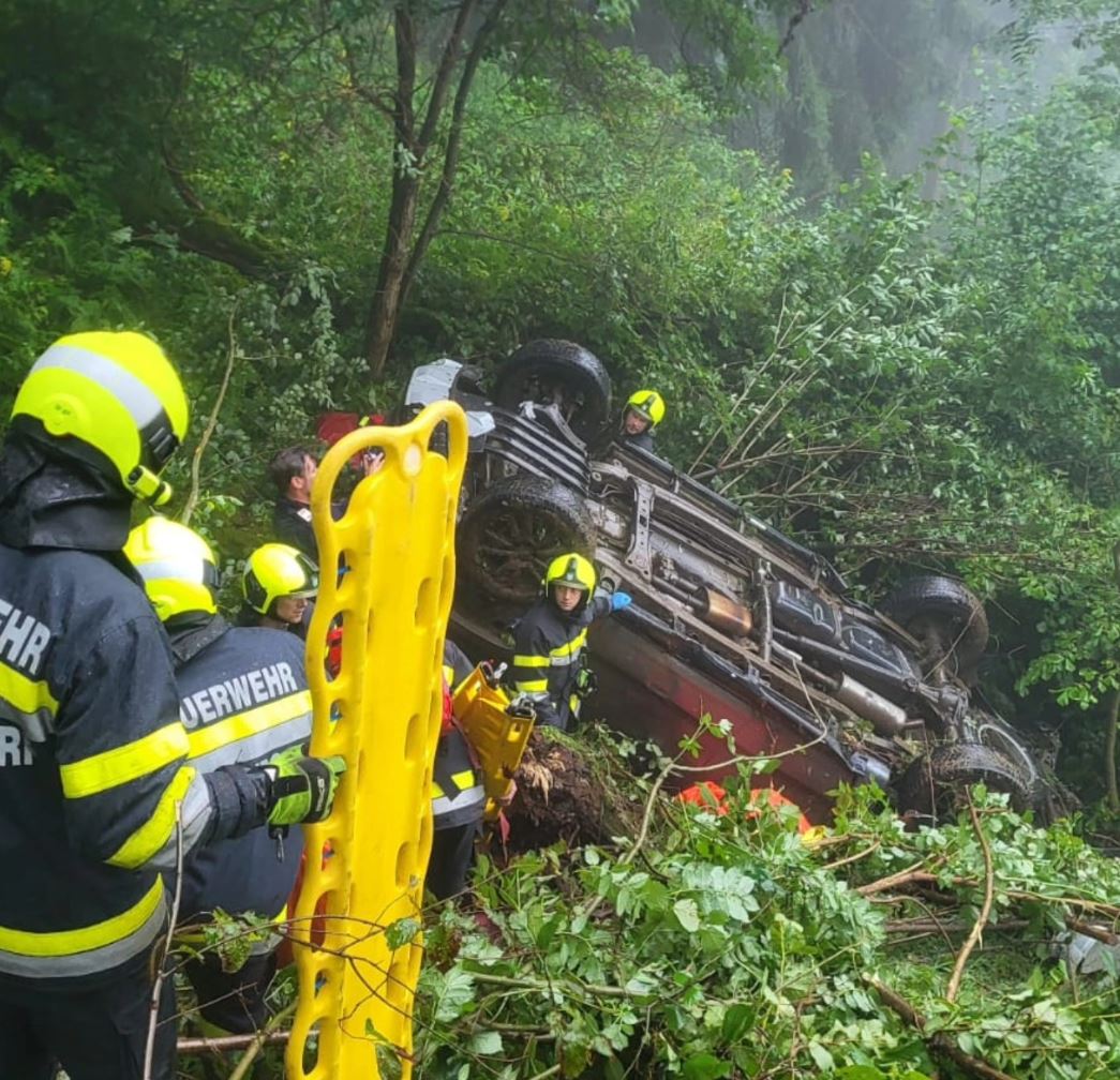 Eine nasse Fahrbahn und Starkregen wurden einem 22-jährigen Lenker, seinem Bruder und deren Großvater zum Verhängnis. Ihr Pkw geriet vom nassen Feldweg ab und stürzte bei einem steilen Gelände 200 Meter in die Tiefe. Dank einer Heldenaktion des Lenkers, konnte ein Notruf abgesetzt werden