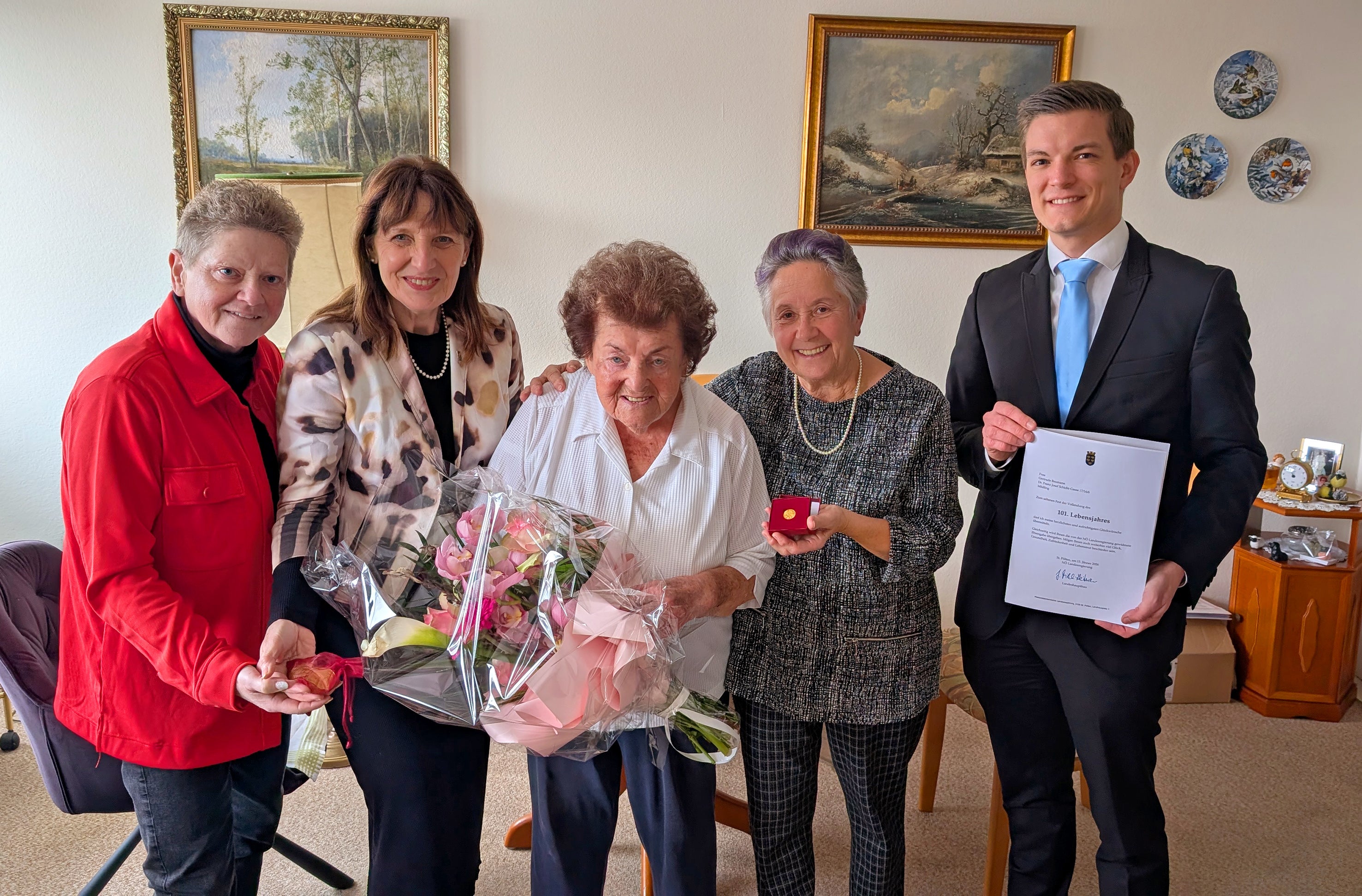 Bei einem Gläschen Sekt plauderte die rüstige Dame über ihre große Liebe zur Oper und kleine Spaziergänge, die sie zur Not auch am Gang ihres Wohnhauses regelmäßig absolviert. Auch der Zusammenhalt der Hausgemeinschaft ist großartig, ihre Nachbarin und langjährige Freundin Elisabeth Heller freute sich gemeinsam mit der Jubilarin über den netten Besuch.