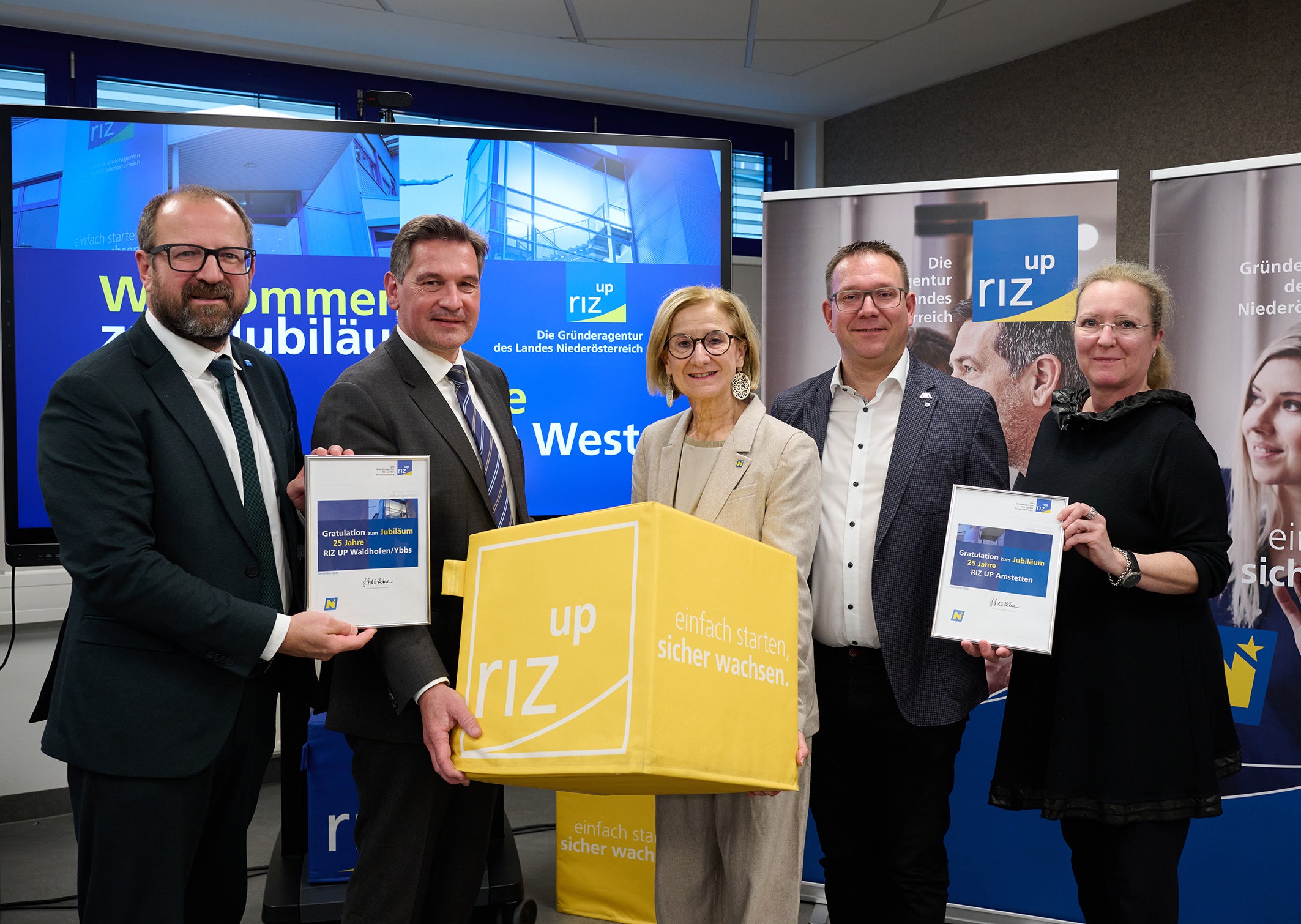 Mitarbeiter der Gründeragentur RIZ UP, Gründer sowie Vertreter aus der Politik, allen voran Landeshauptfrau Johanna Mikl-Leitner (ÖVP), feierten gestern das 25-jährige Jubiläum der Gründerzentren RIZ UP West.