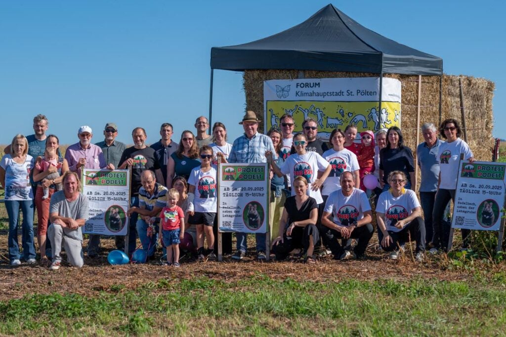 Die Bürgerinitiative versammelt seit dem Wochenende bis zu 100 Personen, darunter Anrainer, Umweltschutzorganisationen und auch Landwirte, gegen den Bau der Schnellstraße S34. An einem Stroh-Podest versammeln sich drei Wochen lang verschiedene Gruppen.
