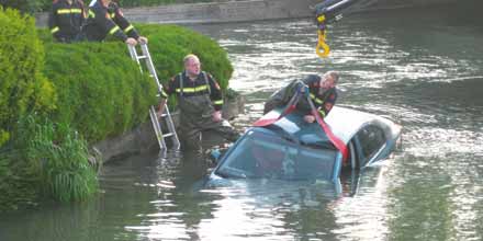 Ternitz. Eine rauschige Disconacht endete am Wochenende für die 32-jährige Natascha P. aus Ternitz im Werkskanal in ihrer Heimatgemeinde. Die Lenkerin hatte mit Freunden bis 6 Uhr früh in Neunkirchen gefeiert. Nach fünf weißen Spritzern und zwei Vodka-Lemon setzte sie sich dann hinter das Steuer ihres grünen Škoda Octavia. Weit kam sie jedoch nicht. An der Kreuzung der B17 mit der Josef-Huber-Straße ging ein Abbiegemanöver gehörig nach hinten los. Die Alkolenkerin schaffte mit 1,68 Promille die Kurve nicht mehr und raste geradeaus in den Werkskanal. Zeugen verständigten die Feuerwehren Neunkirchen und Ternitz, die das Auto mittels Kran wieder aus dem Wasser holten.