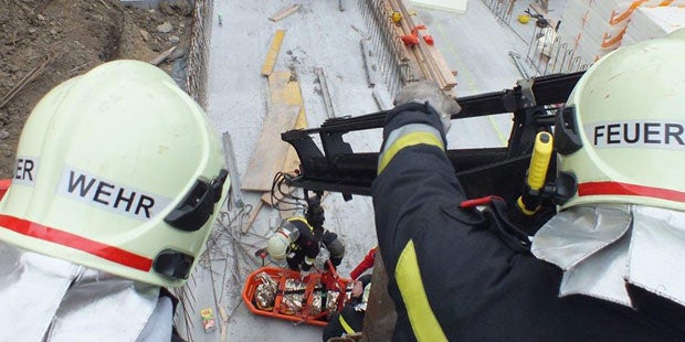 Dementsprechend schwierig gestaltete sich die Bergung des Verunfallten: Er musste von der Feuerwehr mit einem Kranfahrzeug in einer Korbschleiftrage aus der Baugrube gehoben werden.