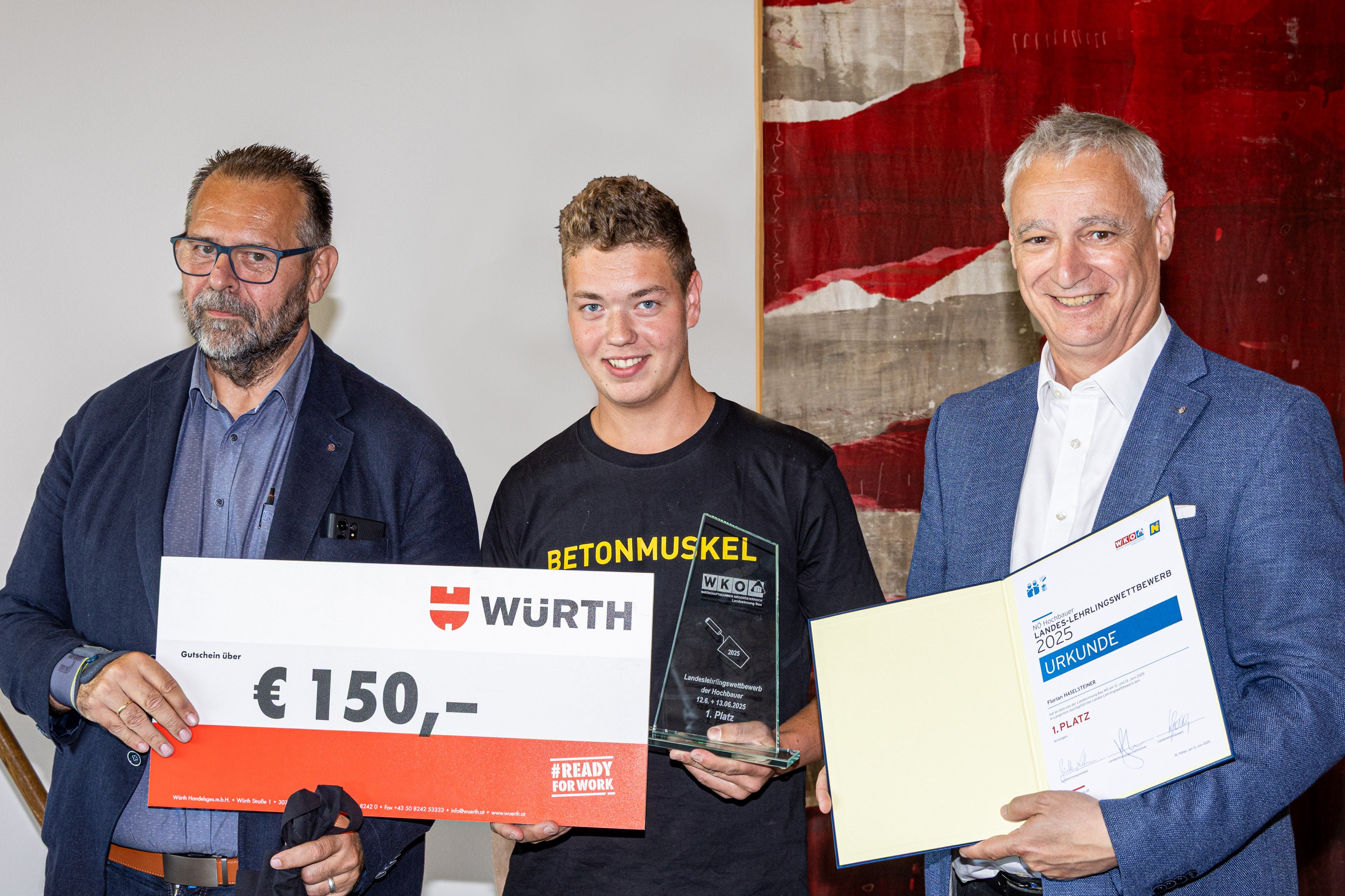 Er setzte sich nach hartem Kampf beim diesjährigen Landeslehrlingswettbewerb in der BAUAkademie NÖ in Langenlois als Sieger durch. Silber holte sich Jonas Haselreither (Ausbildungsbetrieb Schweighofer Bau, St. Georgen an der Leys, Bez. Scheibbs), Bronze ging an Jan Stelzeneder (Ausbildungsbetrieb Wimberger Bau GmbH, Ybbs, Bez. Melk).