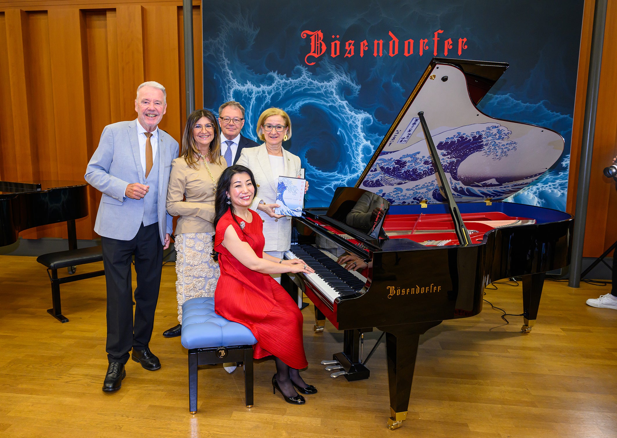 Der Bösendorfer-Flügel trägt den Namen „The Great Wave off Kanagawa“ und ist eine Hommage an das gleichnamige weltberühmte japanische Kunstwerk von Katsushika Hokusai, das oft als „Mona Lisa Asiens“ bezeichnet wird, informierte Bösendorfer-Geschäftsführerin Sabine Grubmüller. Jedes der nur 16 Instrumente dieser Edition sei ein handgefertigtes Meisterstück, betonte sie, und erinnerte ebenfalls daran, dass im Jahr 1869 Ludwig Bösendorfer den ersten Flügel nach Japan brachte, und zwar als Geschenk des österreichischen Kaisers Franz Joseph I. an den japanischen Tenno Mejii.