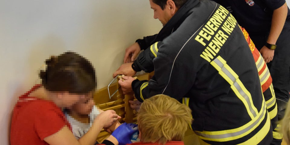 In einem Wiener Neudorfer Kindergarten steckte ein Bub seine Hand so unglücklich in das Holzgestell einer Kugelbahn, dass diese im Spielzeug stecken blieb. Da erste Versuche der Kindergartenpädagoginnen, die Hand aus dem Holzspielzeug zu befreien, scheiterten, alarmierten sie die Einsatzkräfte.