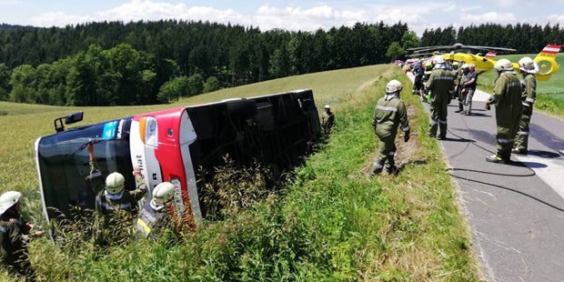 Der Unfall ereignete sich auf einer Gemeindestraße zwischen Pichl und Schlag. Dem Bus kam auf der 4,35 Meter breiten Fahrbahn ein Schülertransport-Pkw, besetzt mit einer 33-jährigen Chauffeurin und fünf Kindern, entgegen. Beide Lenker wichen jeweils nach rechts auf das Straßenbankett aus. Dabei rutschte der Bus über die Böschung in ein Feld ab und blieb dort auf der rechten Fahrzeugseite liegen. Es sei zu keiner Kollision der beiden Kfz gekommen, betonte die Landespolizeidirektion Niederösterreich.