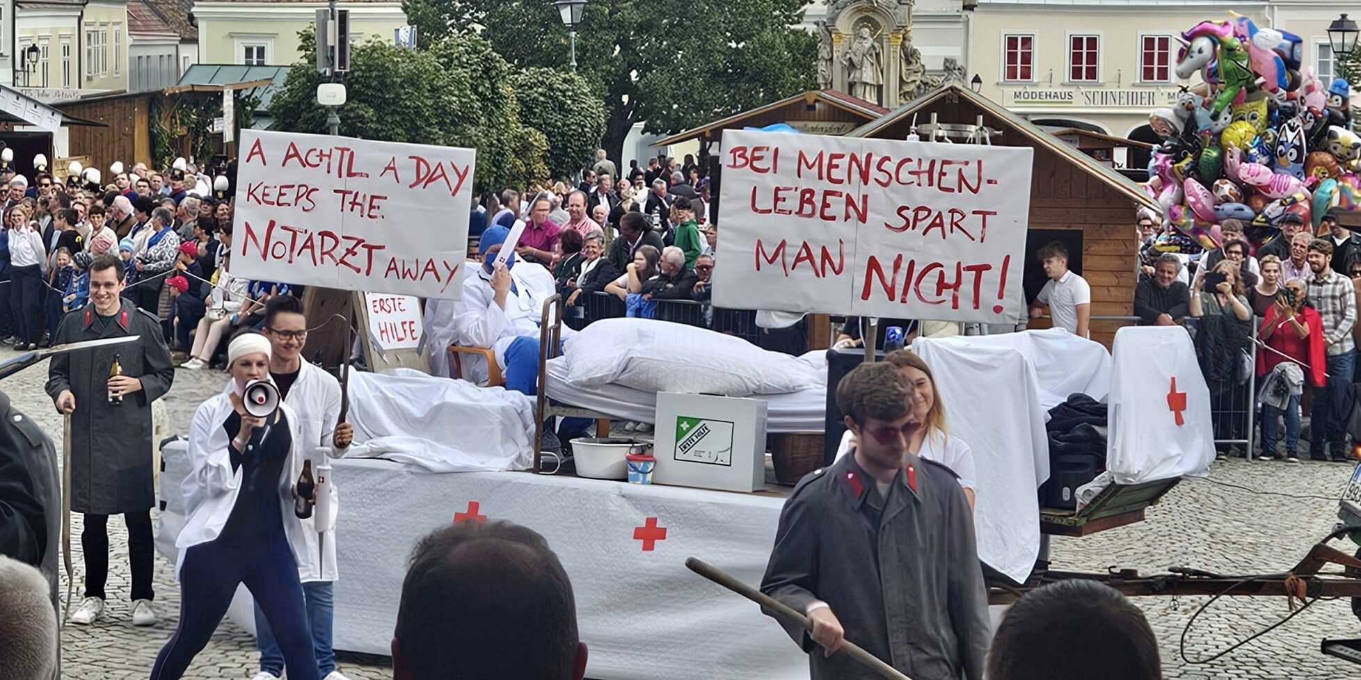 Bekannt provokant und betont kritisch: Aktuelle Themen, die den Retzerinnen und Retzern unter den Fingernägeln brennen, werden traditionellerweise von der K.Ö.St.V. Rugia Retz, einer gemischtgeschlechtlichen Studentenverbindung für Mittelschüler, thematisiert. Dieses Jahr war das Thema naheliegend: ein Thema, das ganz Niederösterreich in Atem hält, macht auch nicht vor Retz halt: der Notarzt im Ort soll ersatzlos gestrichen werden.