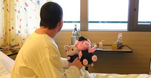 zwei Stoffschweinchen mit. Und die stehen jetzt an seinem Krankenbett: „Ich