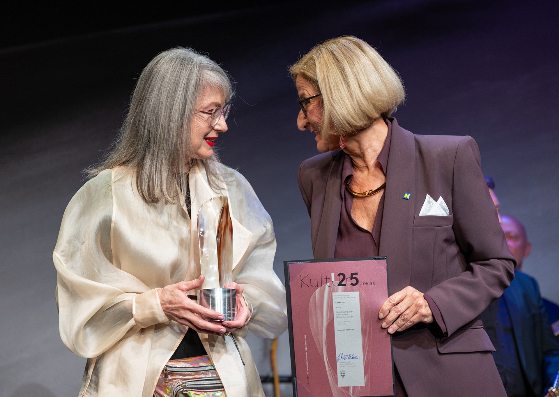 Die Kulturpreisträgerinnen und -preisträger des Jahres 2025 sind in der Bildenden Kunst Iris Andraschek (Würdigungspreis) sowie Christiane Peschek und Jochen Höller (jeweils Anerkennungspreis), in der Darstellenden Kunst Cordula Nossek (Würdigungspreis) sowie die Theatergruppe kollekTief und Alexia Redl (jeweils Anerkennungspreis) bzw. in der Sparte Erwachsenenbildung, Volksbüchereiwesen, Heimatforschung, Verfassen heimatkundlicher Werke und Arbeit für Museen Niklas Perzi (Würdigungspreis) sowie die Weinviertel Akademie und Christian Matzner (jeweils Anerkennungspreis).