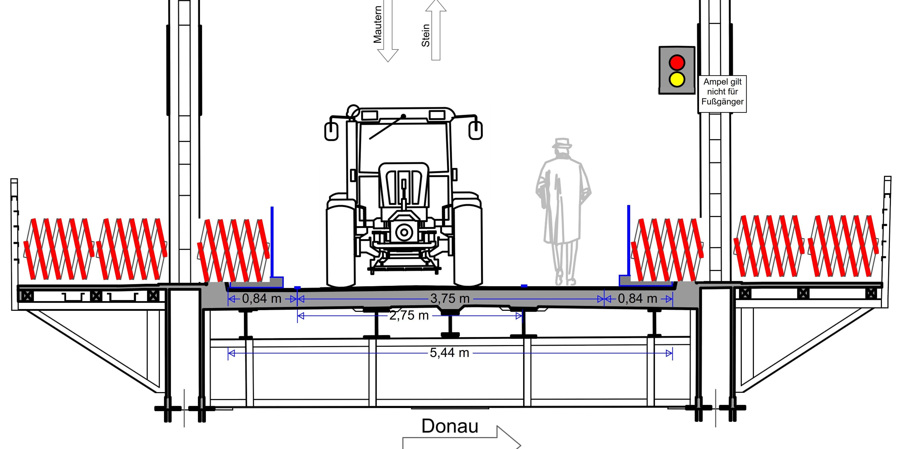 Konkret muss die Fahrbahnbreite der Donaubrücke Stein-Mautern laut Gutachten von derzeit 5,44 Metern auf rund 3,75 Meter reduziert werden. Eine Nutzung der seitlichen Gehwege ist aus Sicherheitsgründen nicht mehr möglich. Die Brücke wird daher künftig einstreifig geführt, für Fußgänger wird ein gesicherter Bereich auf der Fahrbahn eingerichtet. Die Verkehrsregelung erfolgt künftig über eine Lichtsignalanlage mit Rot- und Gelblicht. Mehrspurige Fahrzeuge werden über Sensoren gesteuert. Radfahrer können die Brücke grundsätzlich in beide Richtungen befahren, müssen jedoch bei Rotlicht anhalten.