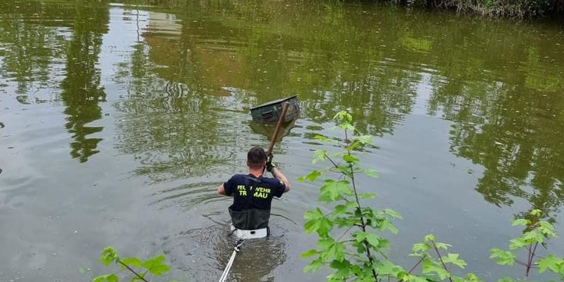 Niederösterreich. Vergangene Woche rückte die Feuerwehr der Gemeinde Trumau zur Unterstützung aus, um eine treibende Metallkiste aus dem "Mandelteich" zu bergen. Mittels Wathose und Sicherung musste sich ein Floriani bis in die Mitte des Teiches vorkämpfen, ehe er die Kiste erreichte. Nach erfolgreicher Bergung wurde die Kiste mittels hydraulischem Rettungsgerät mit Gewalt geöffnet. Da der Inhalt der Kiste unbekannt war, entschied man sich bewusst gegen den Einsatz eines Winkelschleifers, wie die Freiwillige Feuerwehr Trumau berichtet.